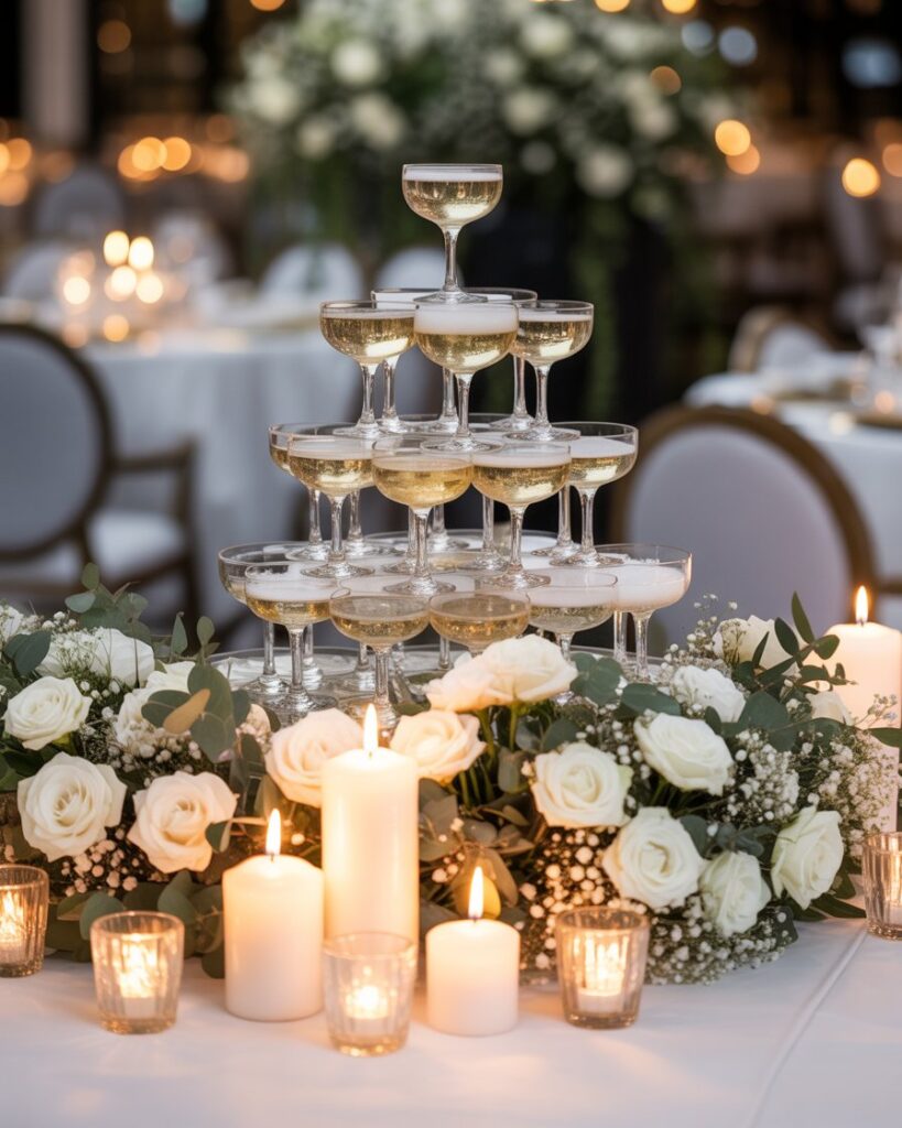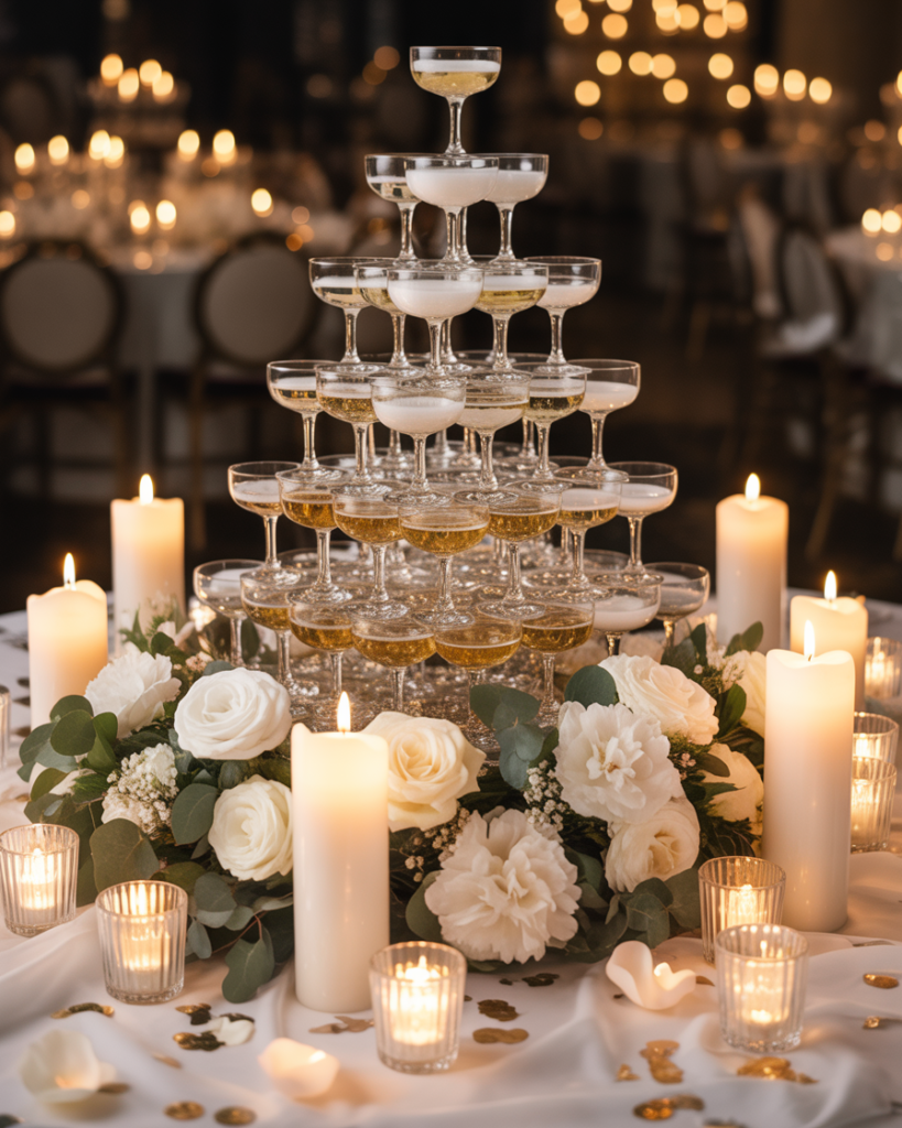 Make your champagne moment part of the décor! Arrange a glowing champagne tower surrounded by flowers and gold decorations. This aesthetic centerpiece can anchor your reception, symbolizing abundance and joy as guests toast to the new year.