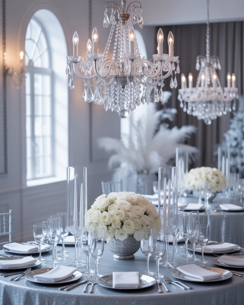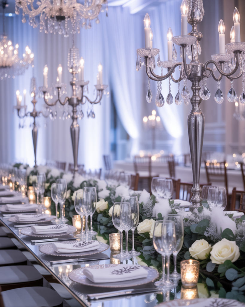 Transform your venue into a snowy dreamscape using soft white flowers, frosted bouquet accents, and icy silver decorations. This theme is perfect for couples who want a fresh, cozy feel while still embracing elegance. Add crystal chandeliers and snowy table decor to bring that fairytale glow to your reception.