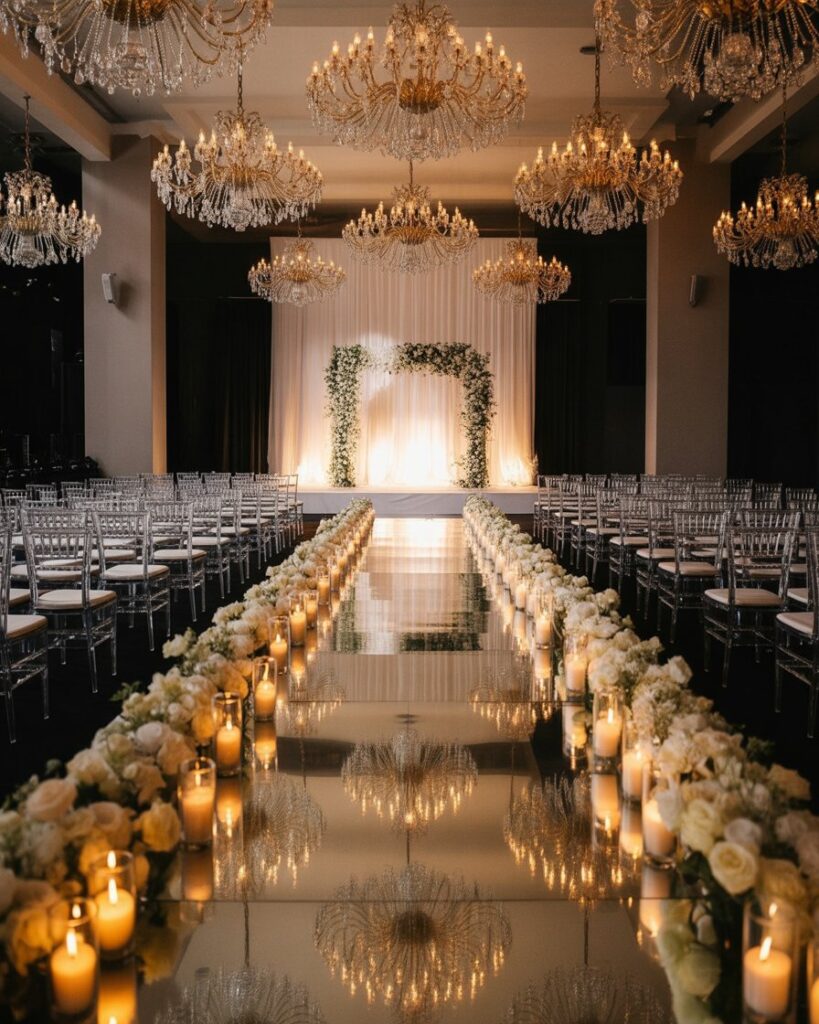 Create a breathtaking entrance by designing a reflective mirror aisle that captures candlelight and glimmers with every step. This modern aesthetic elevates the entire reception, complementing elegant decorations and your chosen color palette. As your guest watches you walk down the mirrored path, the scene feels timeless—like stepping into a dream at midnight.