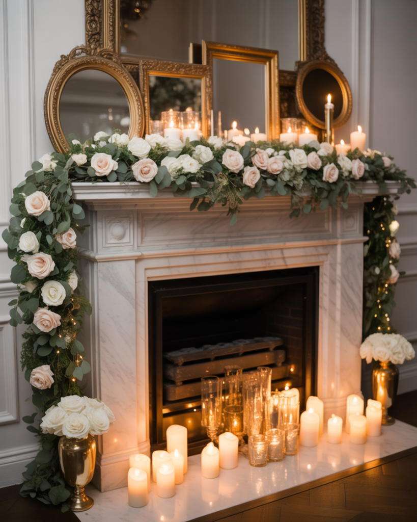 If your venue has a fireplace, decorate it with lush flowers, candles, and gold-framed mirrors. This focal point becomes both romantic and photogenic. The glowing fire adds warmth and enhances the aesthetic of your winter reception.