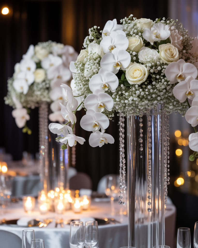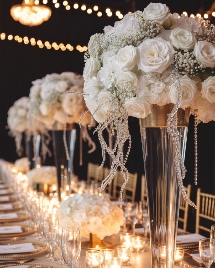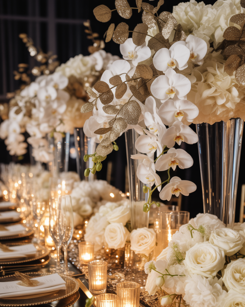 Go big with tall floral centerpieces combining seasonal flowers like white roses, orchids, and amaryllis. Add glittering branches or crystal strands for height and drama. According to Martha Stewart Weddings, tall décor draws the eye upward, making the space feel grand and luxurious — a must for a New Year’s reception.