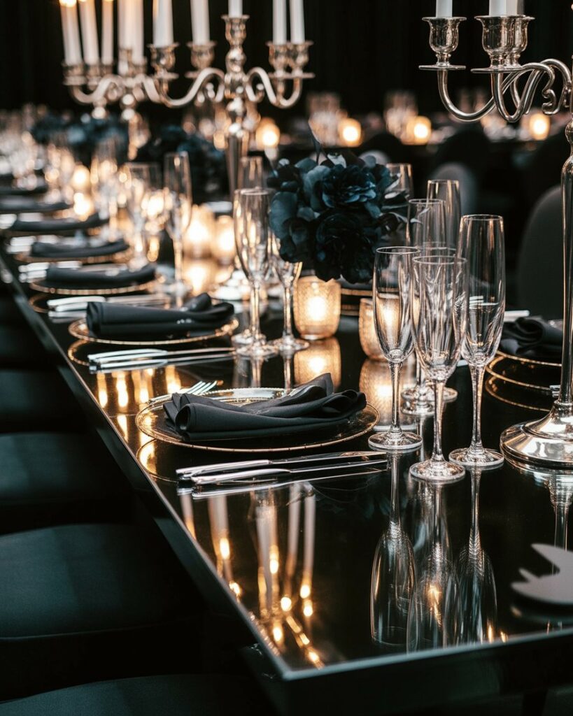Your table decor should shine without overwhelming the room. Mix mirrored runners, black candles, and metallic chargers for a sleek color palette. Personalized invitations or save the dates featuring this theme tie everything together visually. Keep the aesthetic cohesive and refined, avoiding clutter while still dazzling.