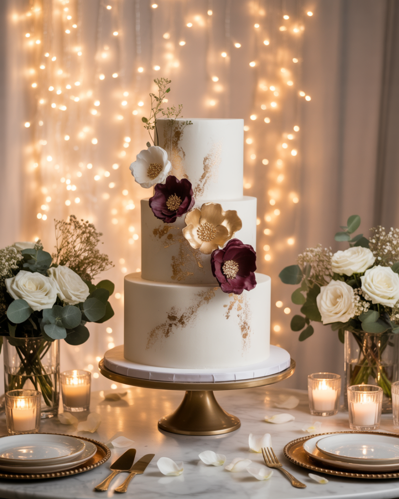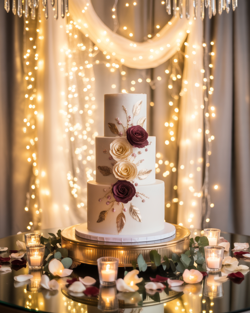 Even the cake can be part of your décor masterpiece. Place it under cascading lights or surrounded by centerpieces and table decor that echo your color palette. A shimmering cake table adds excitement and makes every guest stop for a closer look — it’s décor and dessert in one.