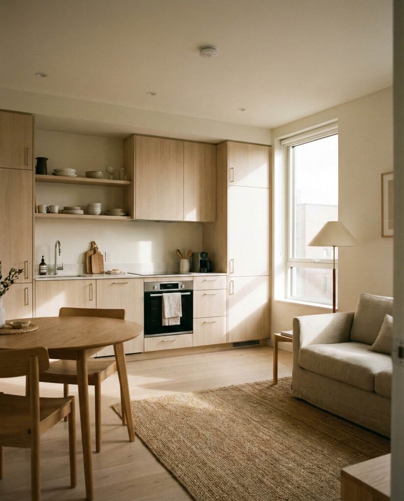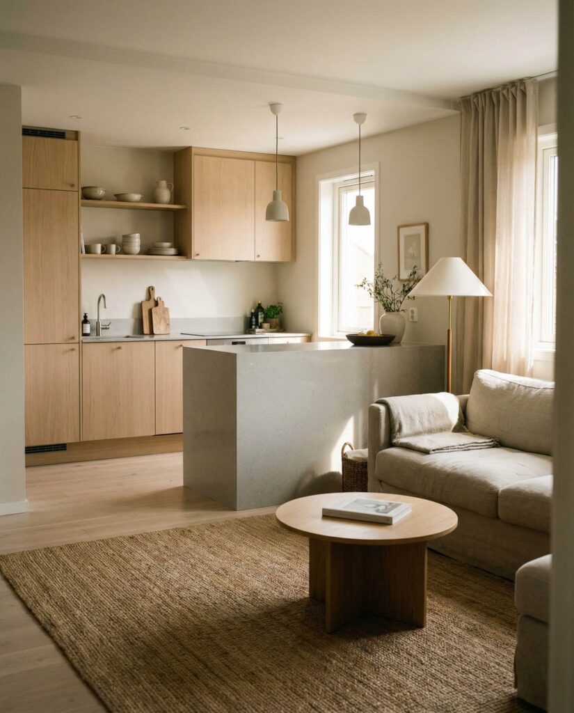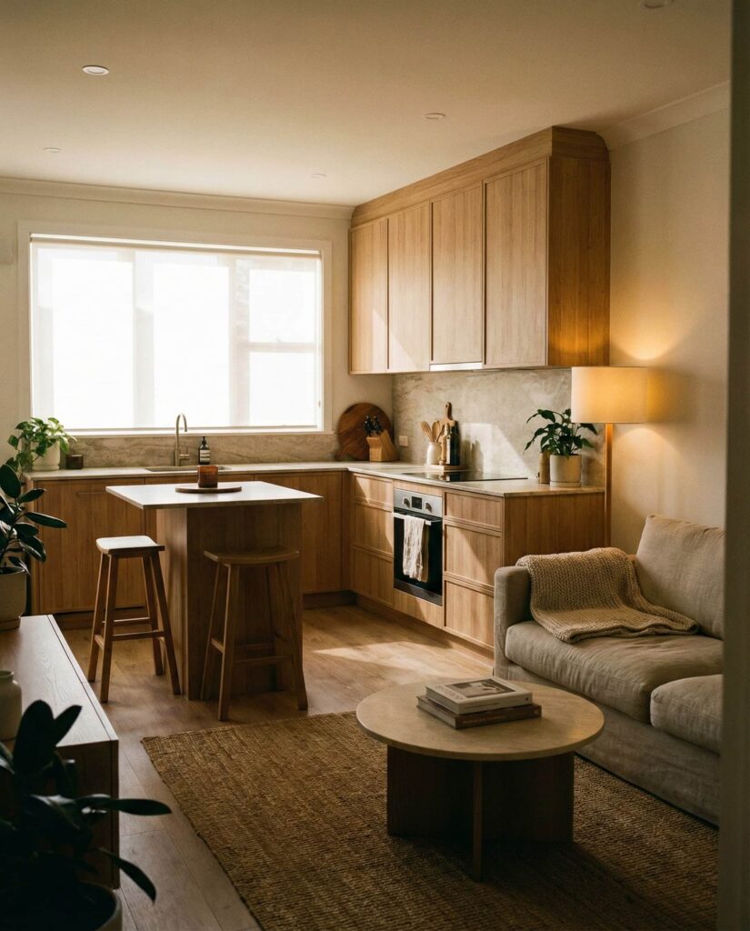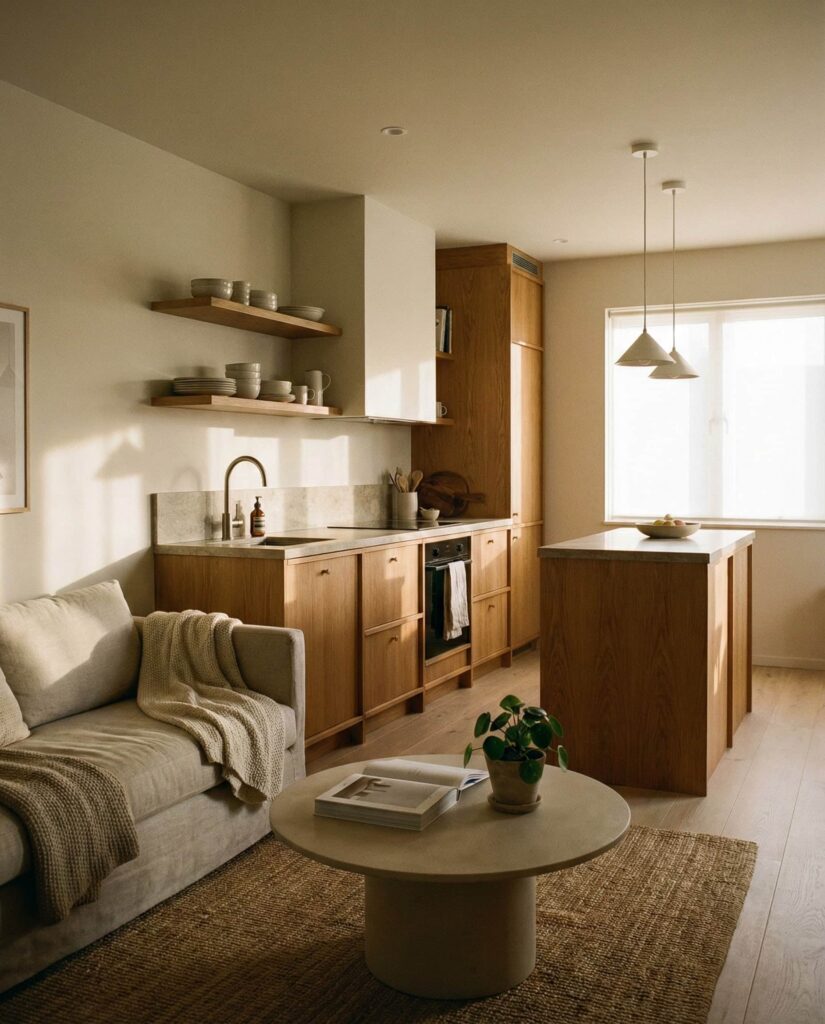When an open kitchen meets a Small living room, thoughtful zoning becomes essential. This idea uses subtle shifts in lighting, rugs, or ceiling height to separate functions without walls. I’ve noticed that in compact homes, visual order matters more than square footage. A restrained simple kitchen palette helps the living area feel calm rather than crowded. This approach works beautifully for small spaces, allowing each zone to feel intentional while remaining connected. It’s a quiet, practical solution that reflects how urban homes are increasingly designed.