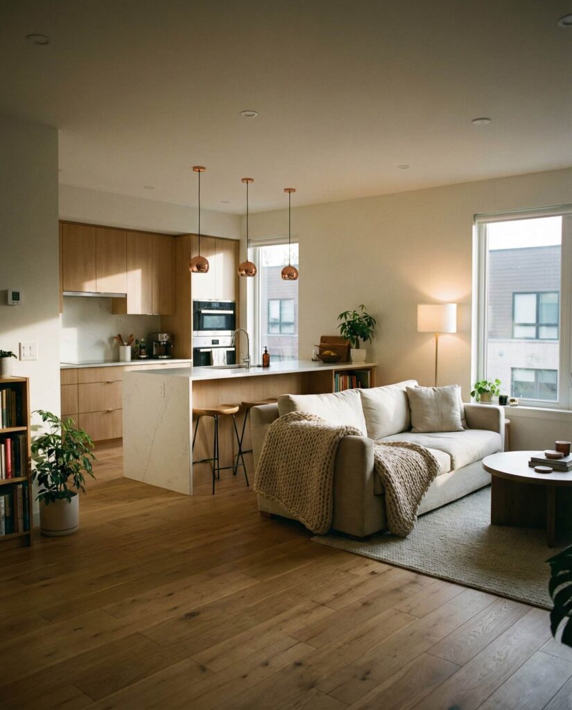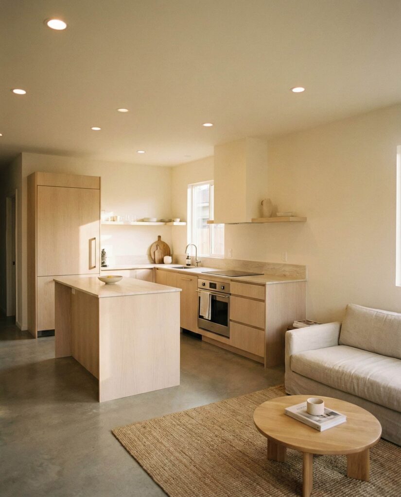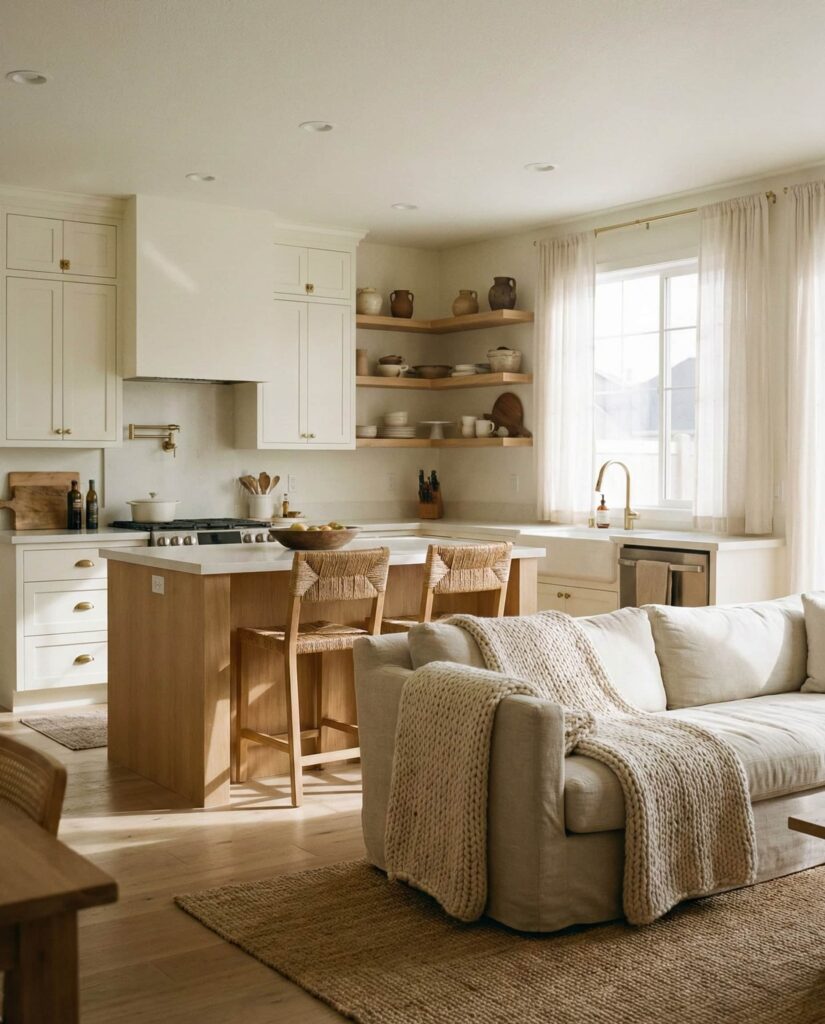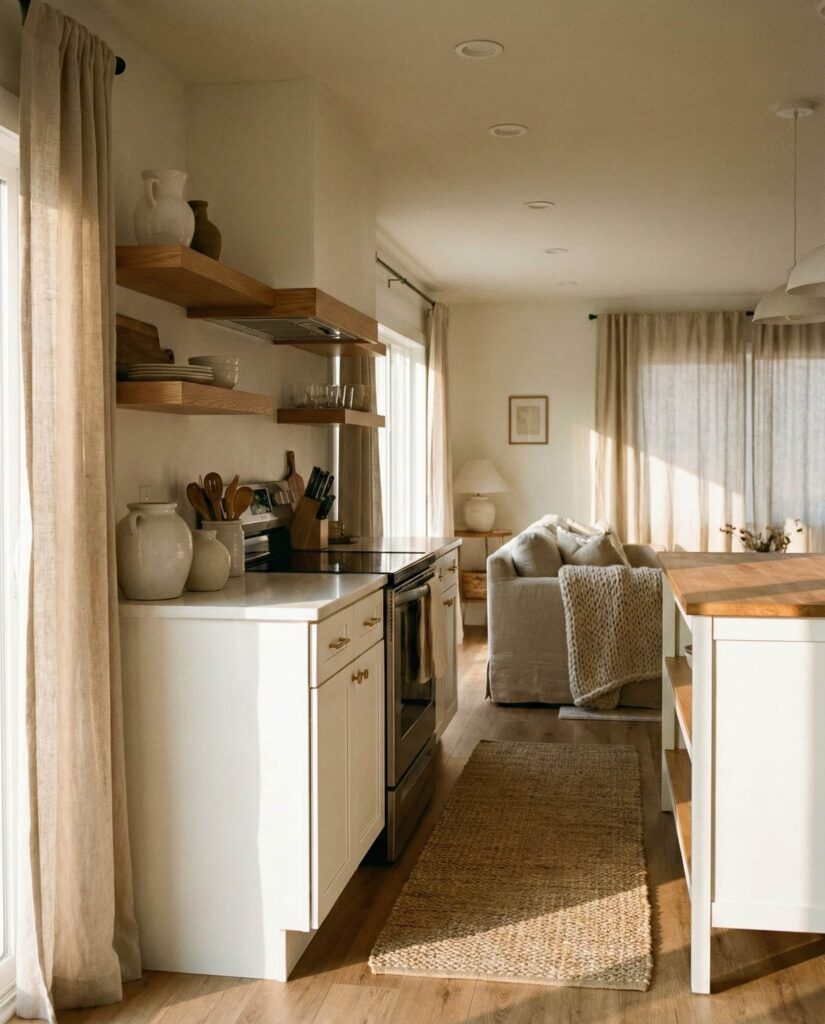 When an open kitchen meets a Small living room, thoughtful zoning becomes essential. This idea uses subtle shifts in lighting, rugs, or ceiling height to separate functions without walls. I’ve noticed that in compact homes, visual order matters more than square footage. A restrained simple kitchen palette helps the living area feel calm rather than crowded. This approach works beautifully for small spaces, allowing each zone to feel intentional while remaining connected. It’s a quiet, practical solution that reflects how urban homes are increasingly designed.