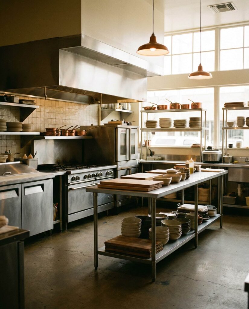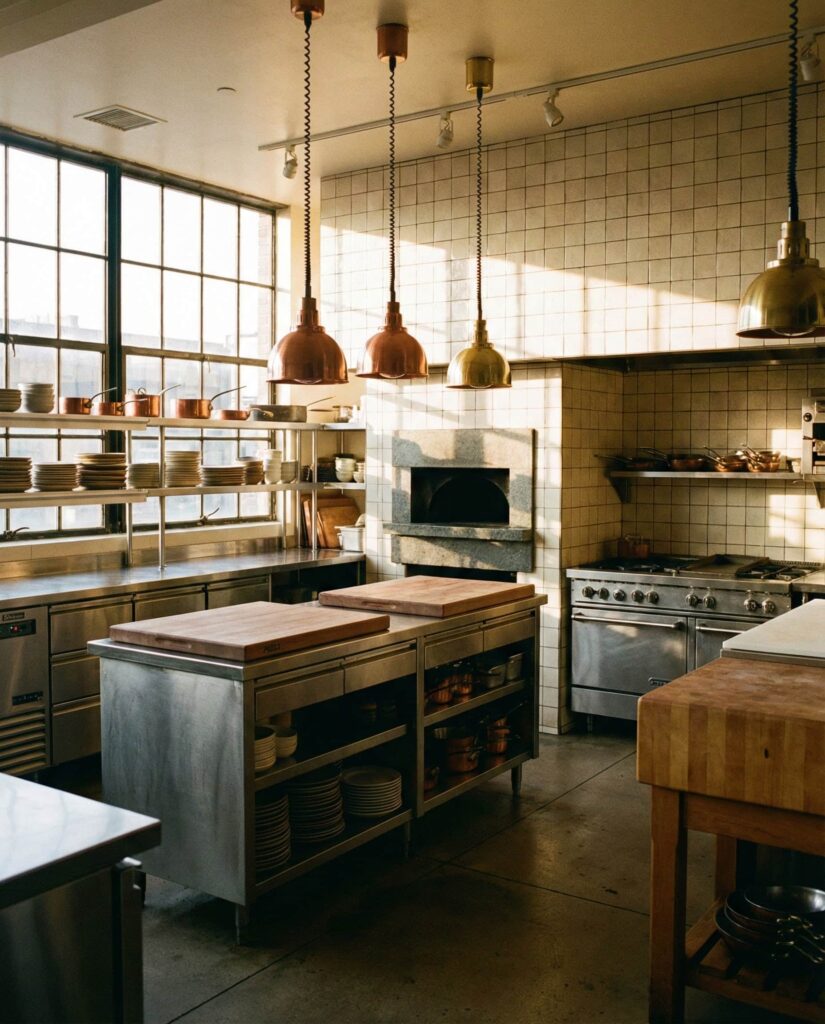 Borrowing cues from a Restaurant kitchen brings energy and efficiency into residential spaces. Open shelving, visible prep areas, and durable surfaces create a confident, functional look. I’ve seen homeowners enjoy this setup because it encourages interaction and transparency. In open plans with living room, this style feels bold yet welcoming, especially when softened with warm lighting. It’s ideal for people who love cooking as performance rather than routine, blending practicality with personality.