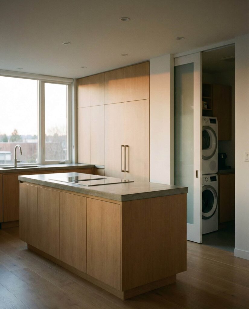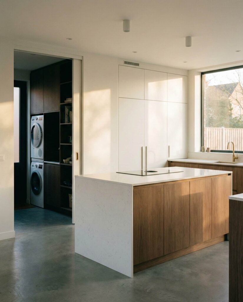 This idea separates mess from view by adding a discreet Side utility area while keeping the main kitchen open. I’ve seen how this improves daily comfort, especially in busy households. The visible kitchen remains calm and Aesthetic, while storage and prep stay tucked away. Integrated into Living room modern layouts, this solution supports openness without sacrificing function, making it ideal for families who value order.