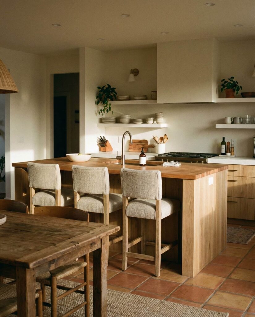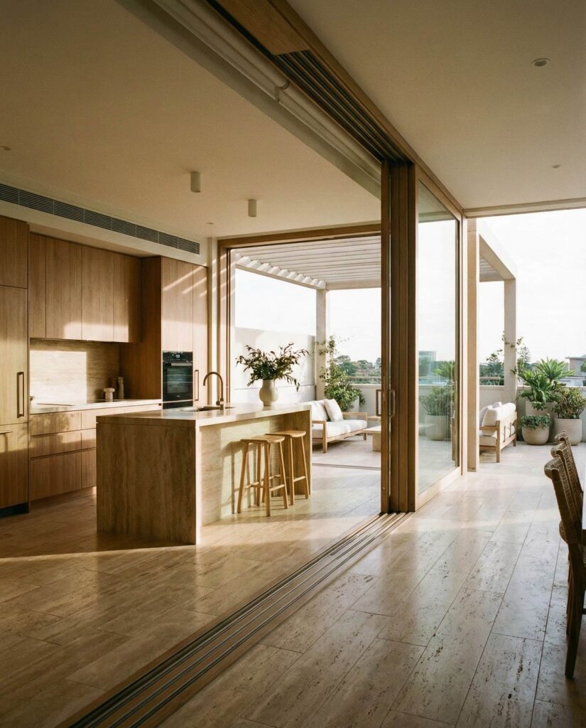 An open kitchen opening onto a Terrace extends daily life outdoors. I’ve noticed people use these kitchens differently, cooking lighter meals and lingering longer. Consistent flooring and materials help blur boundaries, while the kitchen remains functional year-round. This idea works especially well in warmer climates, where openness supports everyday comfort rather than special occasions.