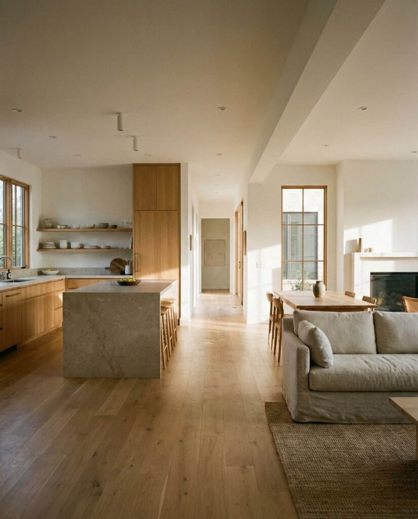 An open kitchen organized around a Dining table reflects how many families actually live today, where meals, work, and conversation overlap. Instead of pushing dining to the Side, this idea places the table between the kitchen and Living room, acting as a natural connector. I’ve seen this work especially well in Large apartments and renovated houses where formality feels unnecessary. The kitchen remains Modern yet approachable, blending into the Sitting room without sharp visual breaks. This layout suits both Small spaces and expansive plans, offering flexibility while maintaining a grounded, everyday rhythm that feels honest and social.