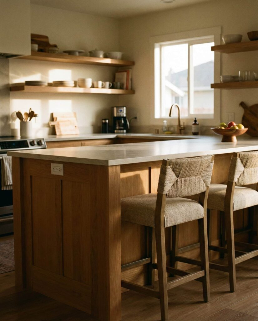 A Kerala-inspired open kitchen emphasizes airflow, natural materials, and relaxed transitions. Rooted in kerala style design, these kitchens often open toward a Terrace or garden-facing area, blurring indoor and outdoor boundaries. I’ve always admired how this style feels calm rather than curated. Wood, stone, and soft lighting create an atmosphere that supports slow living. It’s a refreshing alternative for homeowners seeking openness without sleek minimalism.
