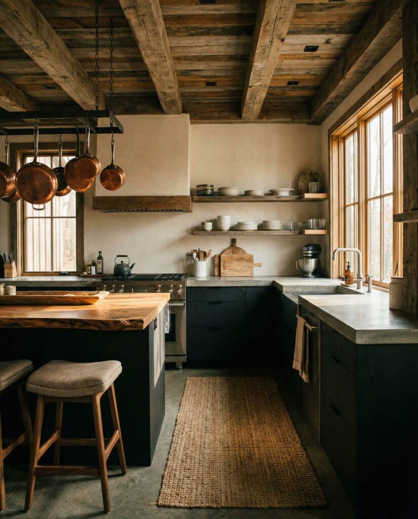 A Rustic open kitchen brings warmth to contemporary homes when paired carefully with clean lines. Exposed wood, textured surfaces, and handcrafted details soften open layouts that might otherwise feel too polished. I’ve seen this style work especially well in suburban homes where the kitchen opens into a casual family area. The contrast between rustic elements and modern planning creates spaces that feel lived-in, not styled for show.