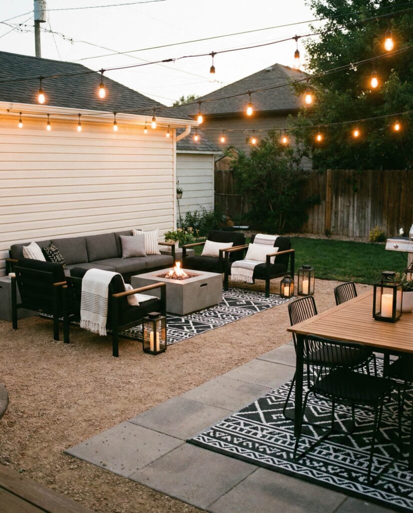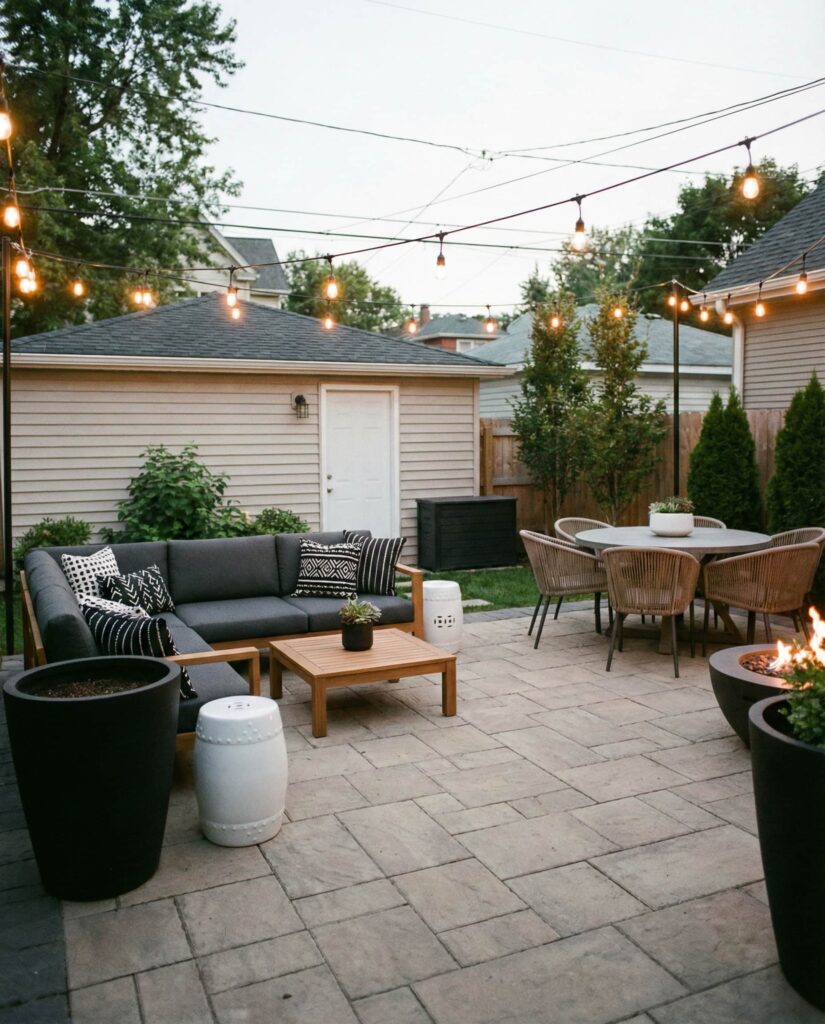 A modern backyard patio in 2026 is less about furniture sets and more about zoning. Using Patio makeover string lights as a visual anchor, homeowners create dining, lounging, and conversation areas without walls. I’ve noticed friends using this approach for a simple weekend party, where lighting defines the mood as the sun sets. Neutral furniture mixed with black and white accents keeps the look timeless, while warm bulbs soften the structure. This idea works especially well for renters or first-time homeowners who want impact without renovation. Designers often suggest this layout for both casual evenings and milestone events like a birthday party or even a small wedding, because the atmosphere adapts effortlessly as guests move through the space.