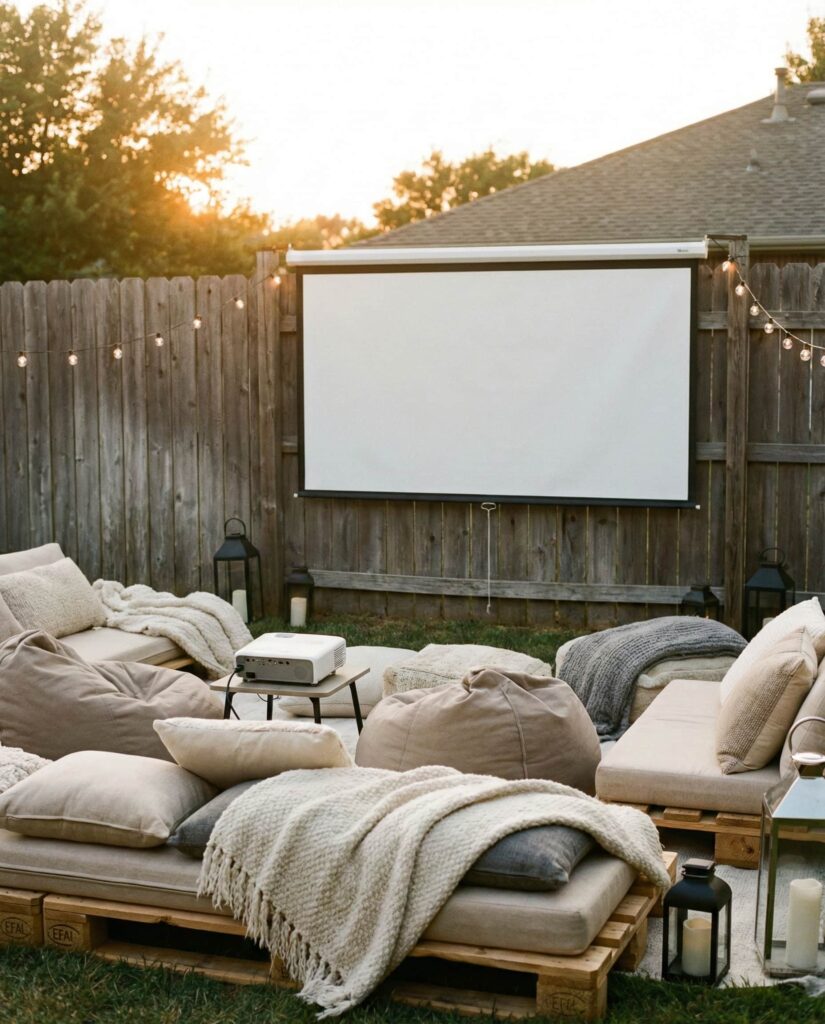 Backyards in 2026 are designed for shared experiences, and movie-night lounges are among the most loved ideas. A neutral seating setup, outdoor screen, and layered textiles create a relaxed zone perfect for a summer party or family evening. I’ve noticed how this setup naturally encourages conversation before and after the film. Designers suggest keeping decor minimal so technology blends into the environment. It’s an awesome idea for homeowners who enjoy entertaining without formality, turning the backyard into a casual social hub that feels effortless and welcoming.