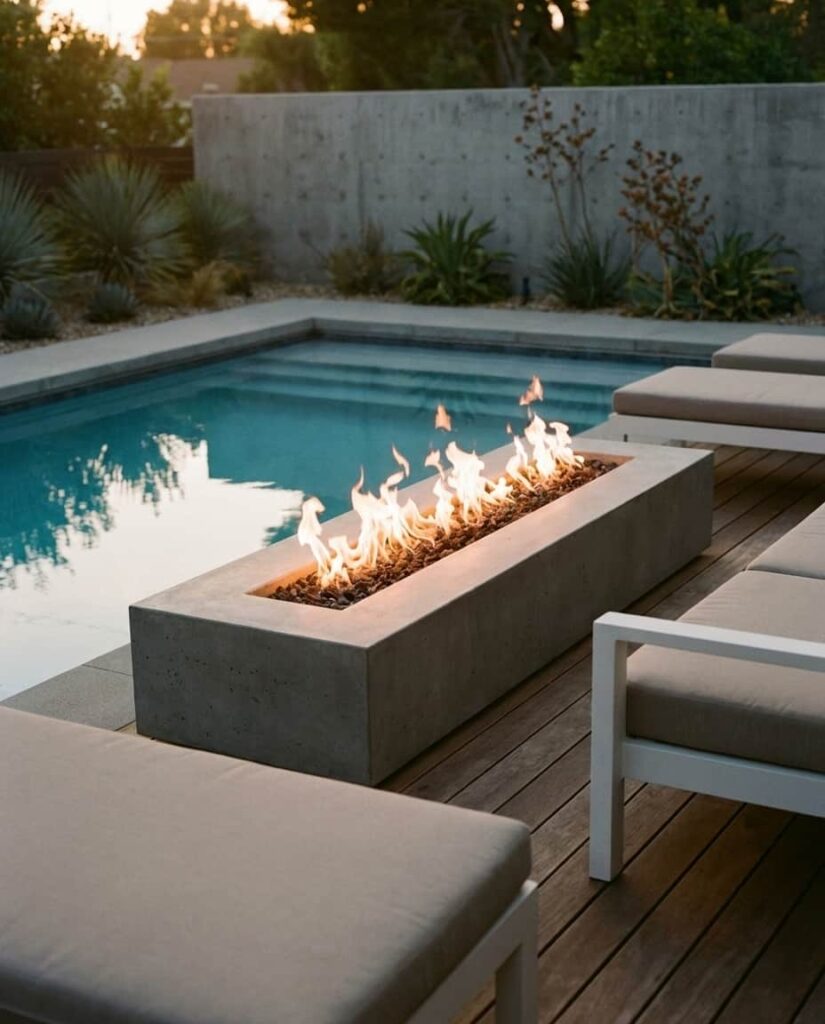Combining fire and water defines Outdoor Decor Backyard 2026. A low-profile fire feature near the pool extends usability into cooler evenings. I’ve experienced how this setup transforms a daytime swimming area into an intimate nighttime party space. Designers emphasize clean lines and subtle materials so the fire complements rather than competes with the pool. This idea suits homeowners who want versatility without clutter, offering warmth, ambiance, and a natural focal point for conversation after sunset.