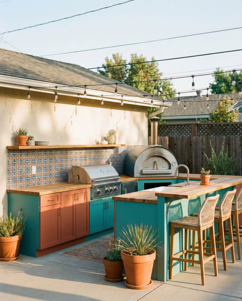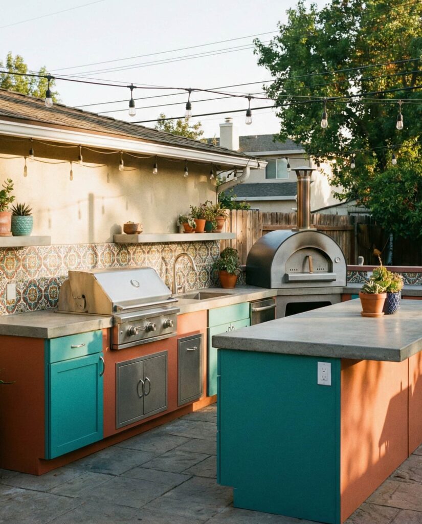 Outdoor kitchens evolve in 2026 with colorful cabinetry, tile backsplashes, and statement surfaces. This approach moves beyond neutral grilling stations into expressive design. I’ve seen homeowners use bold tones to define cooking zones and energize gatherings. Designers recommend anchoring color with durable materials to keep it timeless. It’s ideal for hosts who see cooking as part of the party, creating a backyard that feels social rather than service-oriented.