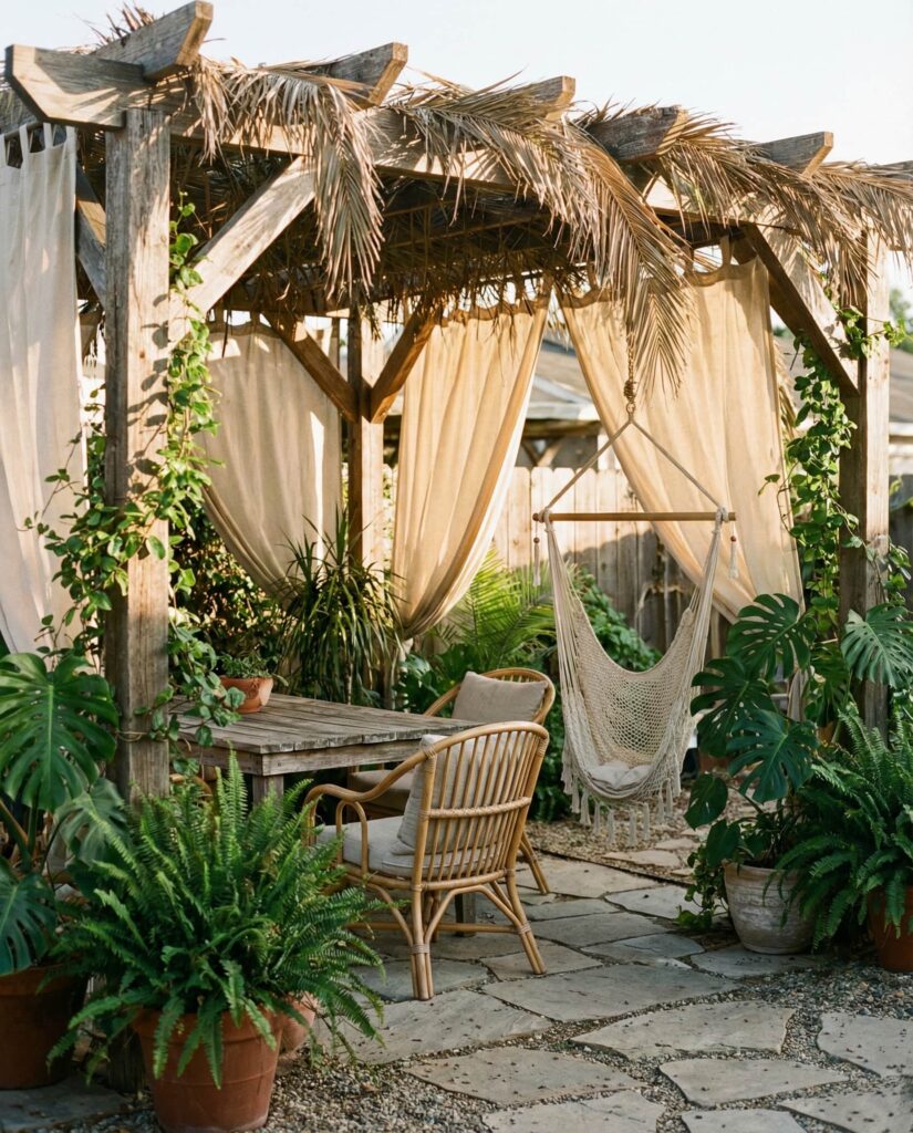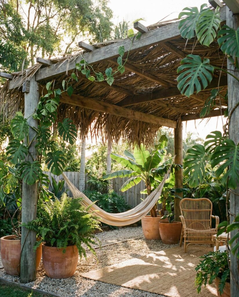 Shade becomes design-forward in Outdoor Decor Backyard 2026. Tropical-inspired pergolas using bamboo, wood, or woven materials provide relief from the sun while adding texture. I’ve noticed this idea works especially well in summer, creating spaces that feel relaxed rather than engineered. Designers suggest pairing shade with greenery and neutral seating for balance. The result is a breezy, vacation-like atmosphere that feels organic and intentional.