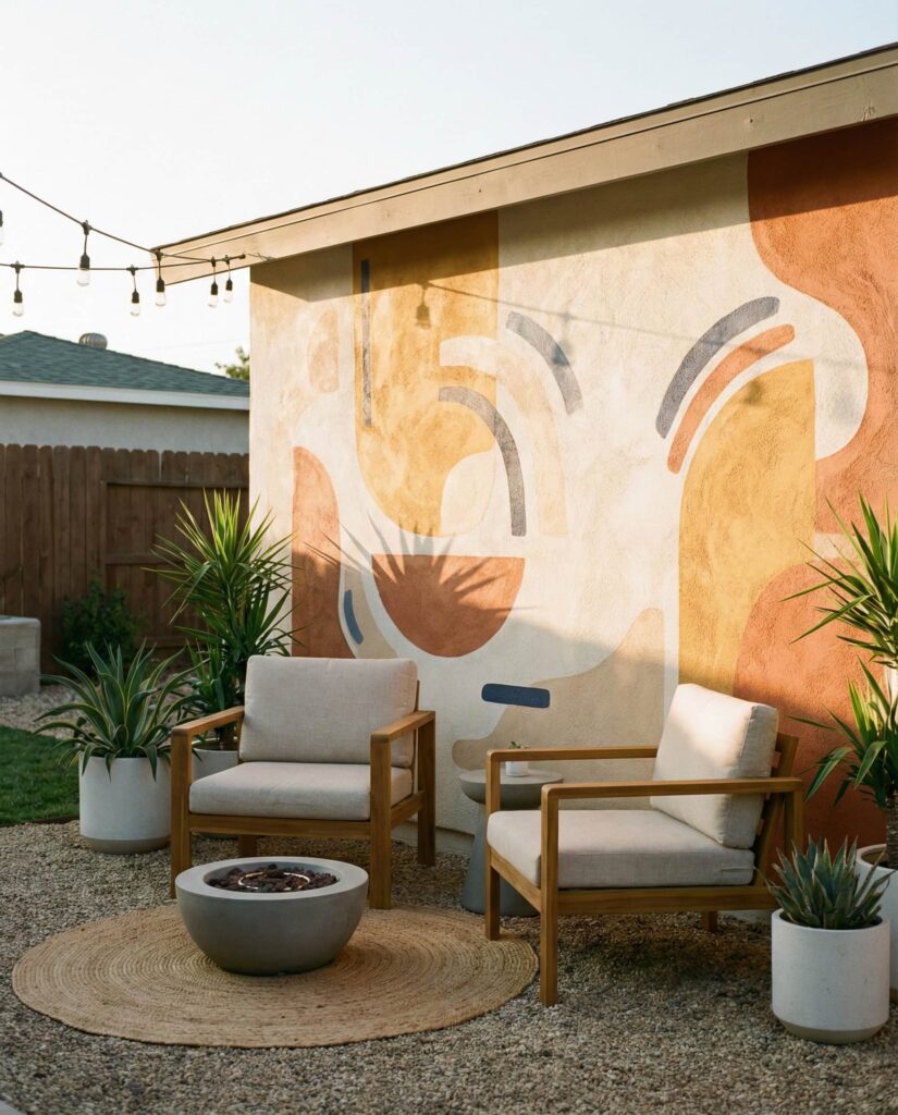 In Outdoor Decor Backyard 2026, decorative wall surfaces become a creative focal point rather than a backdrop. Homeowners are embracing painted murals, textured finishes, or subtle geometric patterns as a DIY upgrade that instantly personalizes the yard. I’ve noticed this idea gaining popularity for summer gatherings, where a bold yet tasteful wall sets the tone for a relaxed party or even a casual birthday party. Designers often recommend limiting the palette to two or three tones, such as muted blue with neutral shades, to keep the look refined. This approach works especially well in small backyards, where one expressive surface can replace excess decor while still feeling intentional and modern.