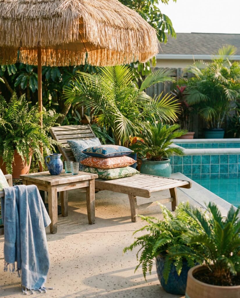A pool area in 2026 feels like a personal resort. The Tropical trend leans into colorful cushions, bold umbrellas, and layered greenery without becoming overwhelming. I’ve attended a casual birthday gathering where this setup instantly shifted everyone’s mood—no travel required. Designers suggest balancing vibrant tones with natural materials like teak or stone to avoid visual clutter. Pops of blue echo the water and create cohesion. This style works beautifully for relaxed entertaining, whether it’s a daytime party or an evening swim with close friends. The goal is escapism that still feels curated and comfortable.