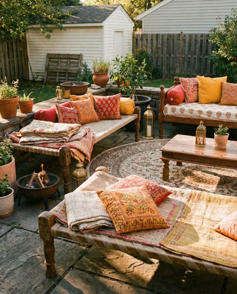 Global influence continues to shape Outdoor Decor Backyard 2026, with Indian textiles playing a major role. Block-printed cushions, low seating, and layered rugs bring warmth and craftsmanship to patios and lawns. I’ve noticed this style resonates with people who want character without committing to permanent changes. The look pairs well with wood furniture and neutral backdrops, letting patterns stand out. Designers recommend this approach for social spaces meant for conversation, tea, or relaxed evenings. It’s decorative but deeply functional, offering comfort that invites guests to linger.