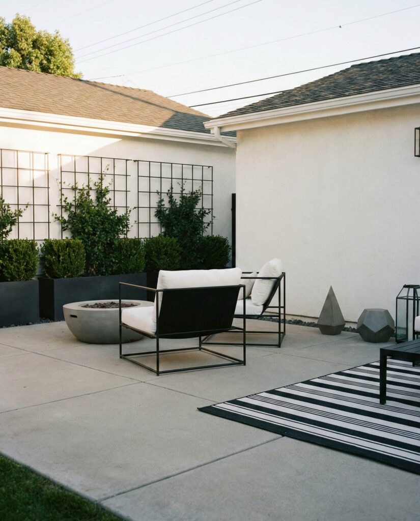 Minimalism remains strong in Outdoor Decor Backyard 2026, especially through black and white palettes. This approach works well in urban courtyards or compact yards where simplicity enhances space. I’ve seen homeowners use this style to create a calm contrast to busy interiors. Clean lines, structured plants, and subtle lighting define the area without excess. Designers often recommend this look for those who want a simple, low-maintenance backyard that still feels intentional and architectural.