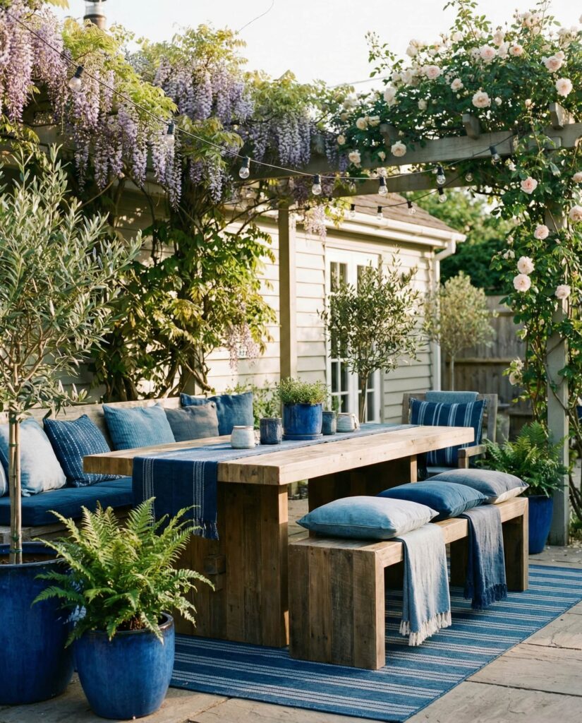 Color psychology plays a role in Outdoor Decor Backyard 2026, with blue leading as a calming choice. From cushions to ceramics, this tone cools visual temperature during hot summer days. I’ve experienced how a blue-focused space feels instantly more relaxing, especially near water features. Designers often pair blue with light wood and greenery to keep it fresh rather than coastal-themed. It’s a versatile option for both everyday use and entertaining.