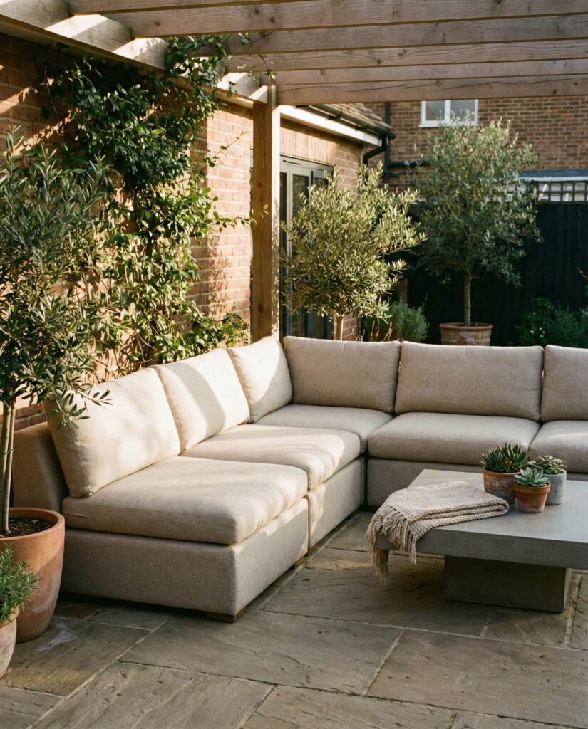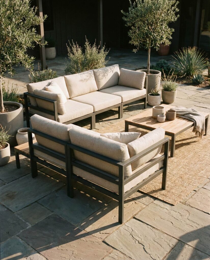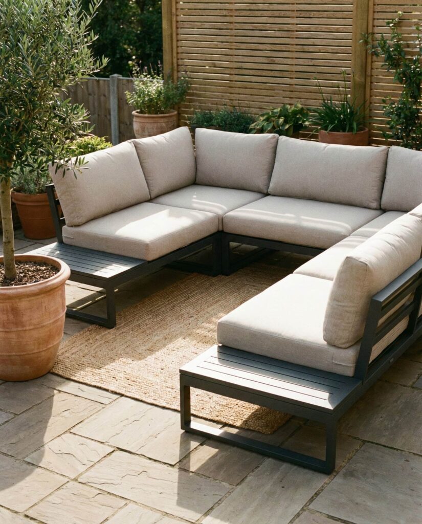 An L-shaped Modular sofa is a smart answer for underused patio corners. This configuration maximizes seating while maintaining open space for movement or a central Table. Designers often rely on set top view planning to balance proportions and avoid overcrowding. I’ve personally found L-shaped sofas ideal for entertaining, as they naturally define conversation zones. Materials range from Metal frames to Rattan, allowing flexibility in style. Design editors at Better Homes & Gardens frequently highlight corner sofas as practical solutions for compact ideas patio layouts, proving that thoughtful design can dramatically improve outdoor area usability.