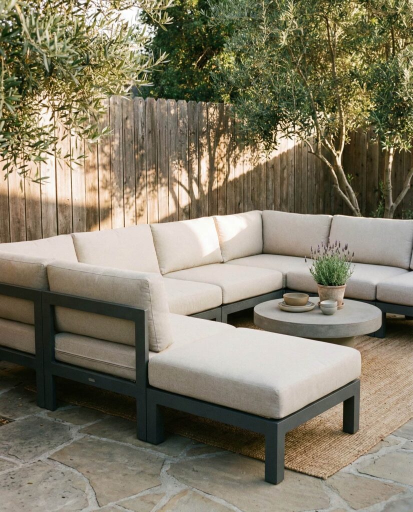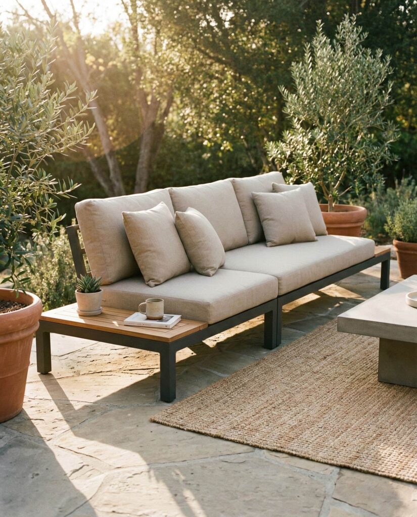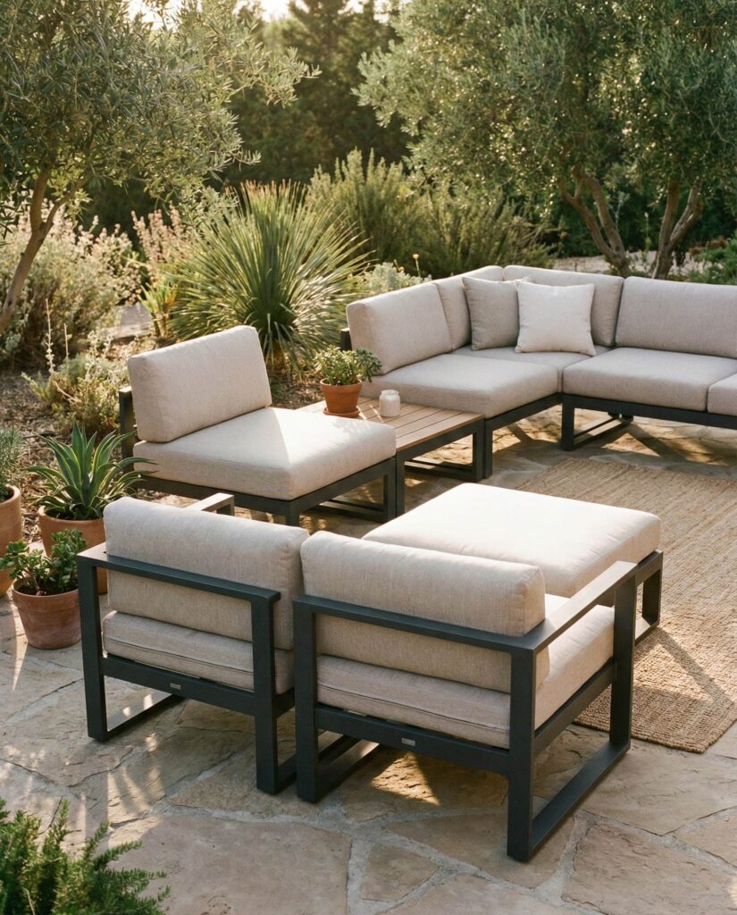 A Modern Modular garden couch is becoming the backbone of flexible outdoor living. These systems allow homeowners to rearrange seating based on occasion, whether it’s casual lounging or hosting friends around a table. Early in the planning stage, many designers sketch layouts using top view, top view png, or set top view diagrams, a technique popularized by landscape planners featured on sites like Dezeen and ArchDaily. I’ve noticed how modular sofas work especially well in multi-use ideas patio layouts, adapting effortlessly to changing needs. Materials often mix Metal frames with weather-resistant Cushions, keeping the look clean but inviting. The appeal lies in freedom: one set becomes many, supporting evolving lifestyles while maintaining cohesive design and long-term value in outdoor furniture planning.