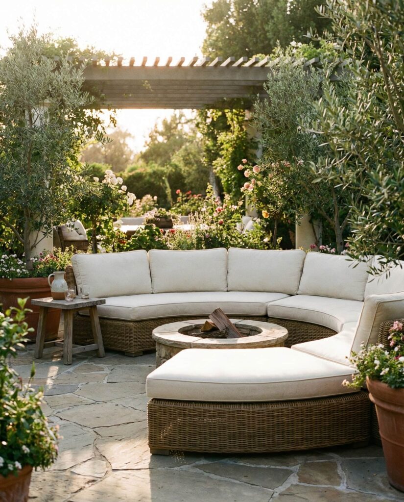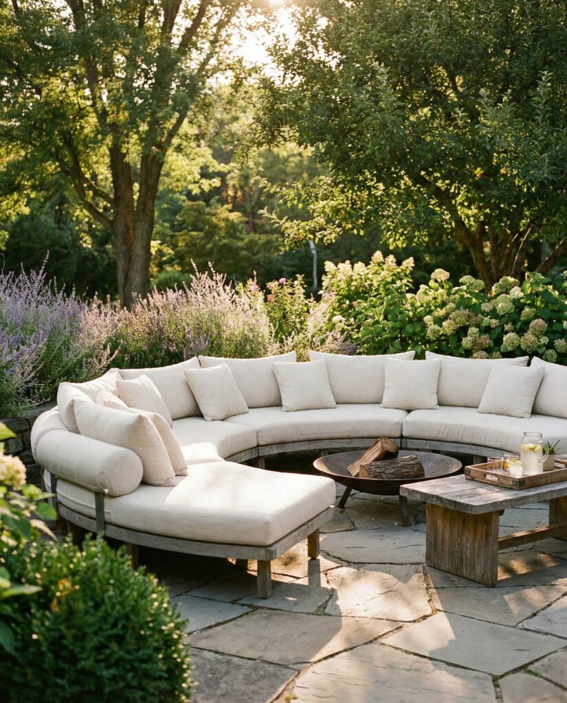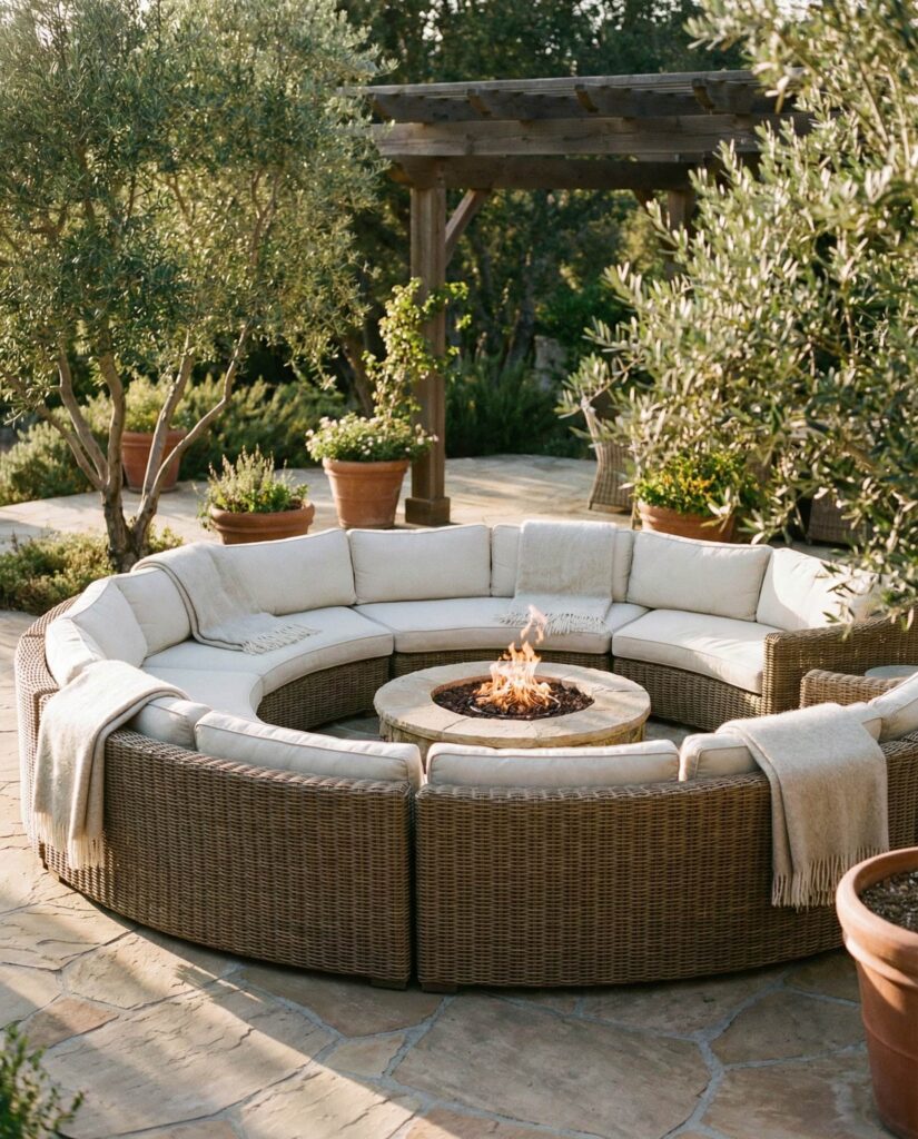 A Round sectional sofa designed to surround a fire feature creates a natural focal point for outdoor gatherings. This configuration encourages face-to-face interaction and shared warmth, redefining social seating. Designers typically begin with top view planning to ensure safe distances and symmetry. Upholstered Cushions provide comfort without distracting from the central element. I’ve seen this layout praised in Sunset Magazine for its ability to anchor large outdoor area designs. The circular Shape softens hardscape elements, making the space feel intentional and inviting while elevating outdoor decor.