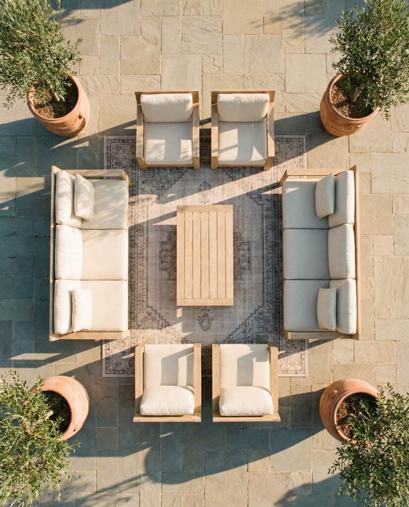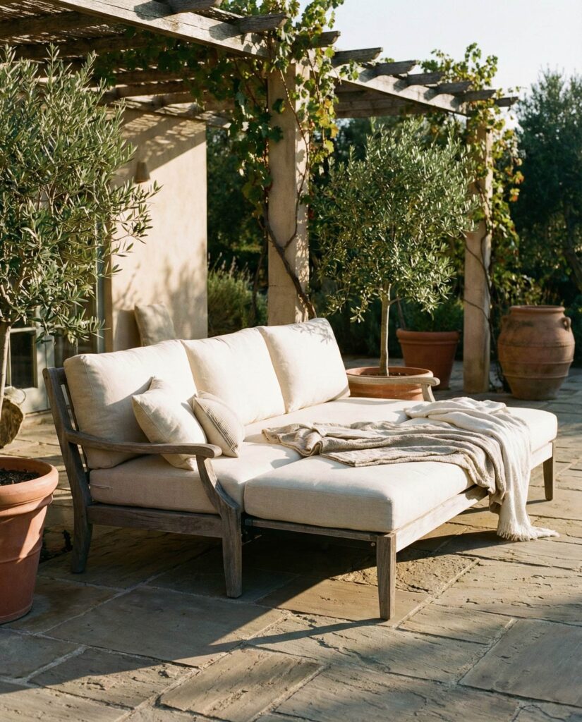 This Modular outdoor sofa concept focuses on creating multiple flexible seating zones within one patio. Individual modules can be separated for small gatherings or combined into a larger set for entertaining. Designers often rely on set top view and top view png layouts to test different configurations before committing. I’ve seen this idea work especially well in family homes, where needs shift between quiet evenings and social weekends. Built with durable Metal frames or Teak, these sofas balance longevity with adaptability. Design platforms like Houzz often highlight modular zoning as a smart response to modern outdoor living, where furniture must evolve with lifestyle rather than dictate it.