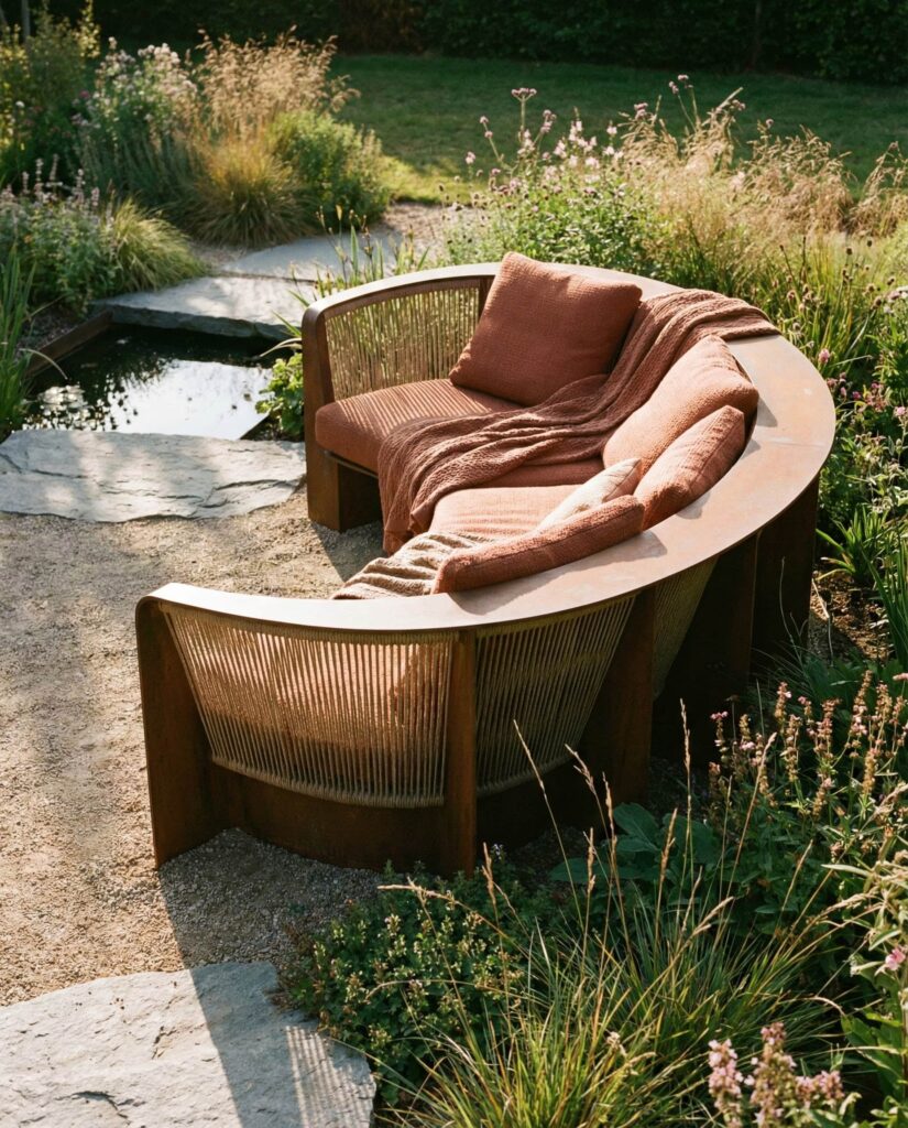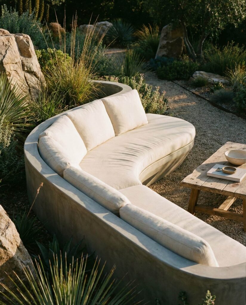 A sculptural outdoor sofa treats outdoor sofas as functional art, designed to be the visual anchor of a garden area. These pieces often feature a bold Shape, sometimes asymmetrical or gently Curved, drawing attention even when unoccupied. Designers usually begin with top view planning to ensure the sofa aligns with sightlines, paths, and surrounding decor. Materials like Concrete, Metal, or smooth Wooden elements are common, balanced by tailored Cushions for comfort. I’ve noticed this approach gaining popularity in projects featured by Architectural Digest, where furniture doubles as landscape sculpture. This idea suits homeowners who want their outdoor furniture to make a confident statement while still offering inviting seating for everyday use.