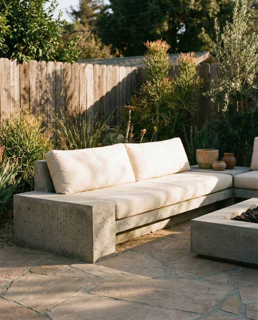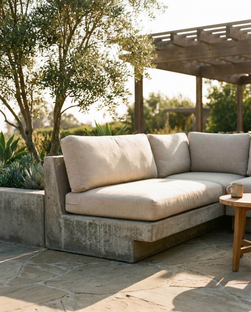 Outdoor sofas with Concrete bases are gaining traction for their durability and sculptural presence. Often combined with Wooden or upholstered elements, concrete sofas feel architectural yet surprisingly inviting. Designers recommend using top view planning to ensure proper circulation, as these pieces are typically fixed in place. I’ve seen them used effectively in desert landscapes and coastal settings where weather resistance is critical. Thick Cushions soften the look, transforming what could feel industrial into relaxed seating. Publications like Dwell praise concrete for its longevity and low maintenance, making it ideal for homeowners who want outdoor furniture that ages gracefully while maintaining a bold design statement.