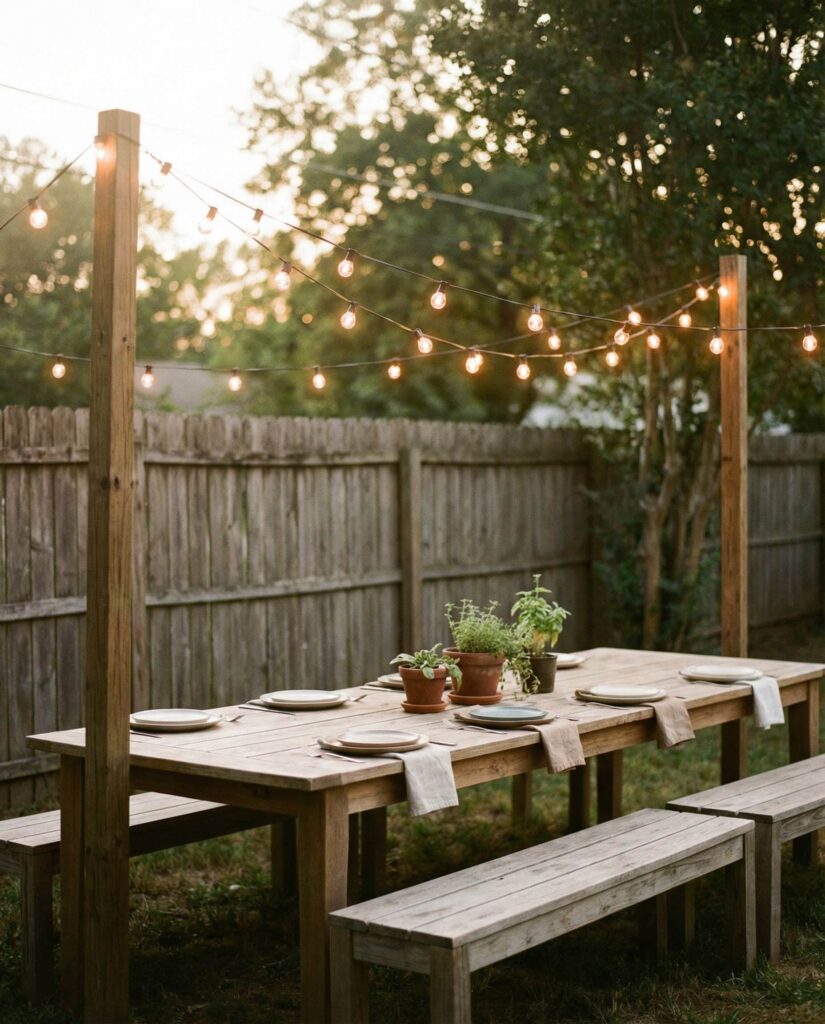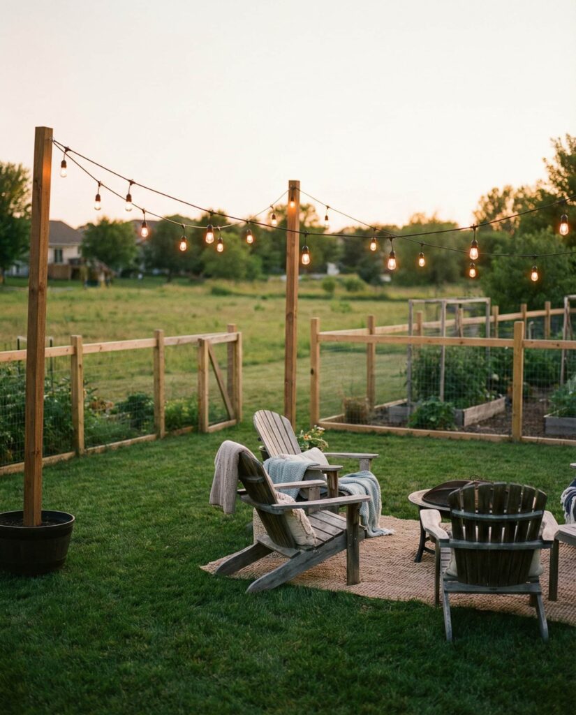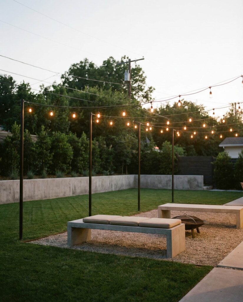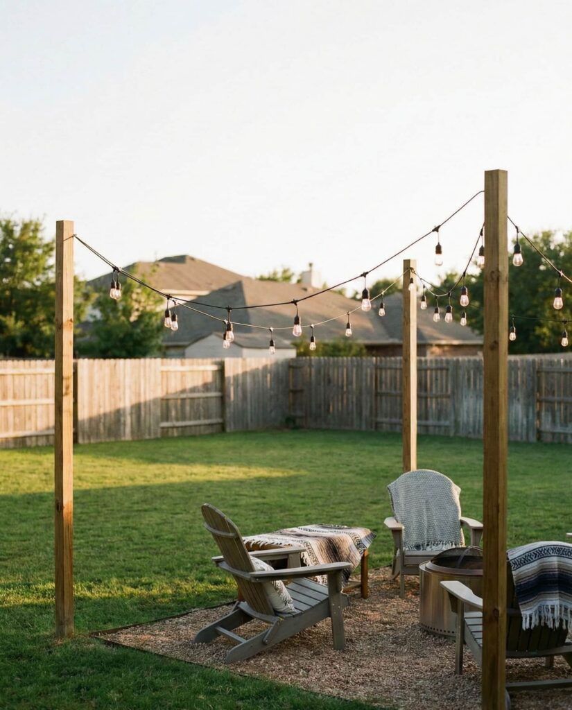 Using to hang string lights on poles or posts has become one of the most adaptable backyard ideas for homeowners who want flexibility without permanent construction. This approach works especially well in open lawns or multipurpose yards where furniture layouts change with the seasons. I first noticed this trend at a casual summer cookout, where simple metal poles anchored the lights without touching the house or fence, keeping the setup renter-friendly. Designers like Emily Henderson often recommend this method because it frames space visually while remaining easy to adjust. Whether you choose sleek steel or wooden poles, the result is an aesthetic glow that defines gathering zones while preserving openness.