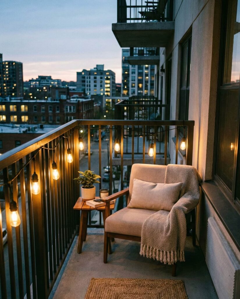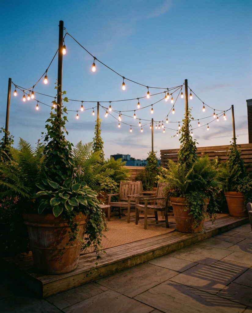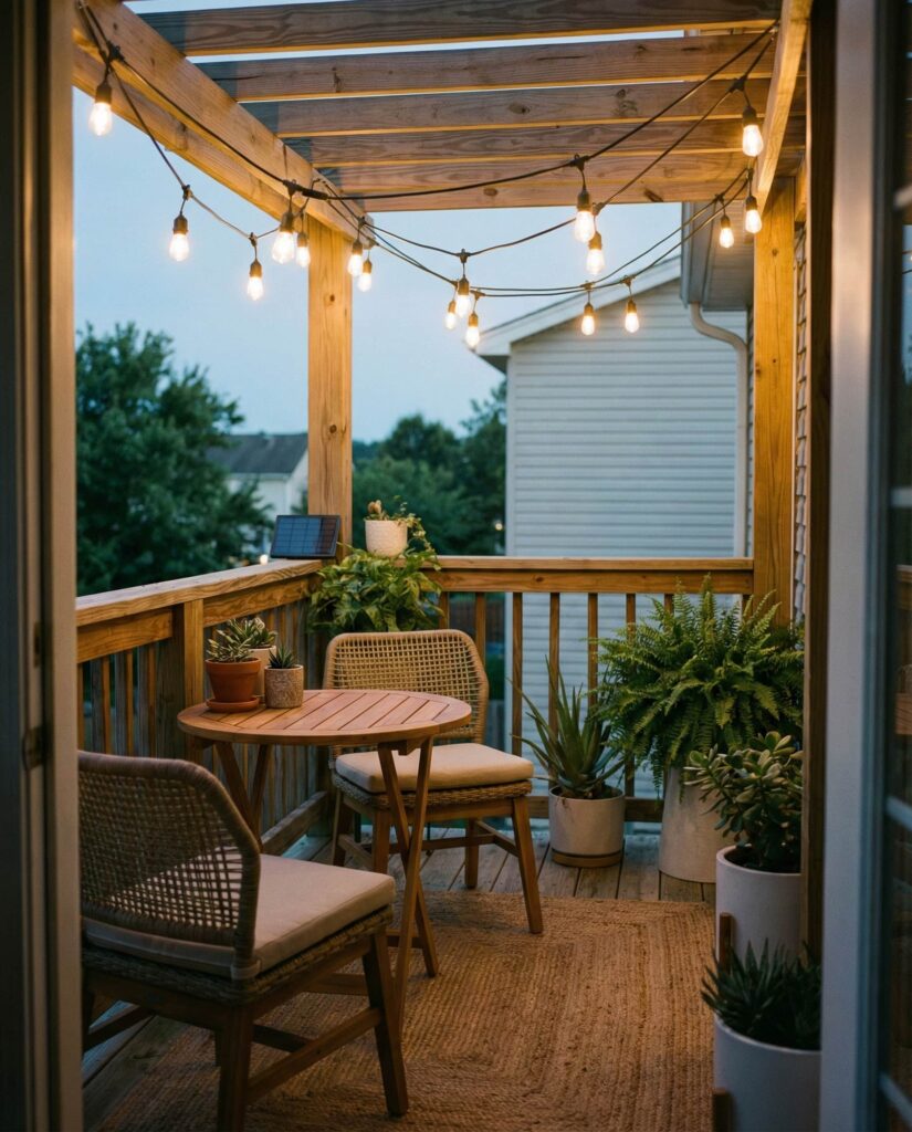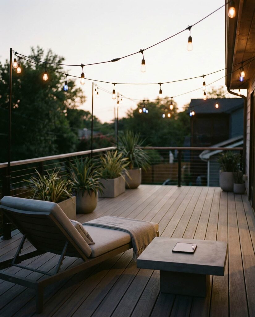 For apartment dwellers, to hang string lights on a balcony has become one of the most practical ideas for creating an outdoor escape without extra square footage. By attaching lights to railings, slim posts, or tension wires, even a narrow balcony gains warmth and personality. I’ve seen friends in city apartments completely change how often they use their balconies once lighting is added. Design writers at Dwell often note that small spaces benefit most from layered lighting. The soft glow enhances the aesthetic, supports evening relaxation, and turns overlooked balconies into personal retreats that feel intentional rather than improvised.