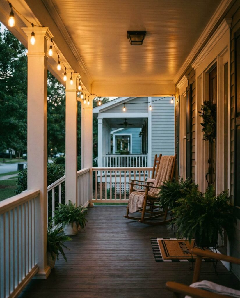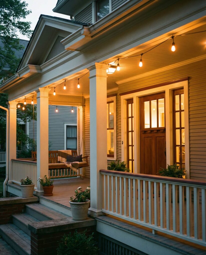 Using string lights on a porch is a subtle way to hang welcoming light without resorting to harsh fixtures. Wrapped along columns, ceiling edges, or discreet posts, they add softness that traditional porch lights often lack. Growing up, I noticed how neighbors with warm porch lighting naturally invited conversation. According to Southern Living, front-facing outdoor lighting sets emotional tone before guests even knock. This approach works across architectural styles and enhances curb appeal while keeping the space comfortable for everyday use.