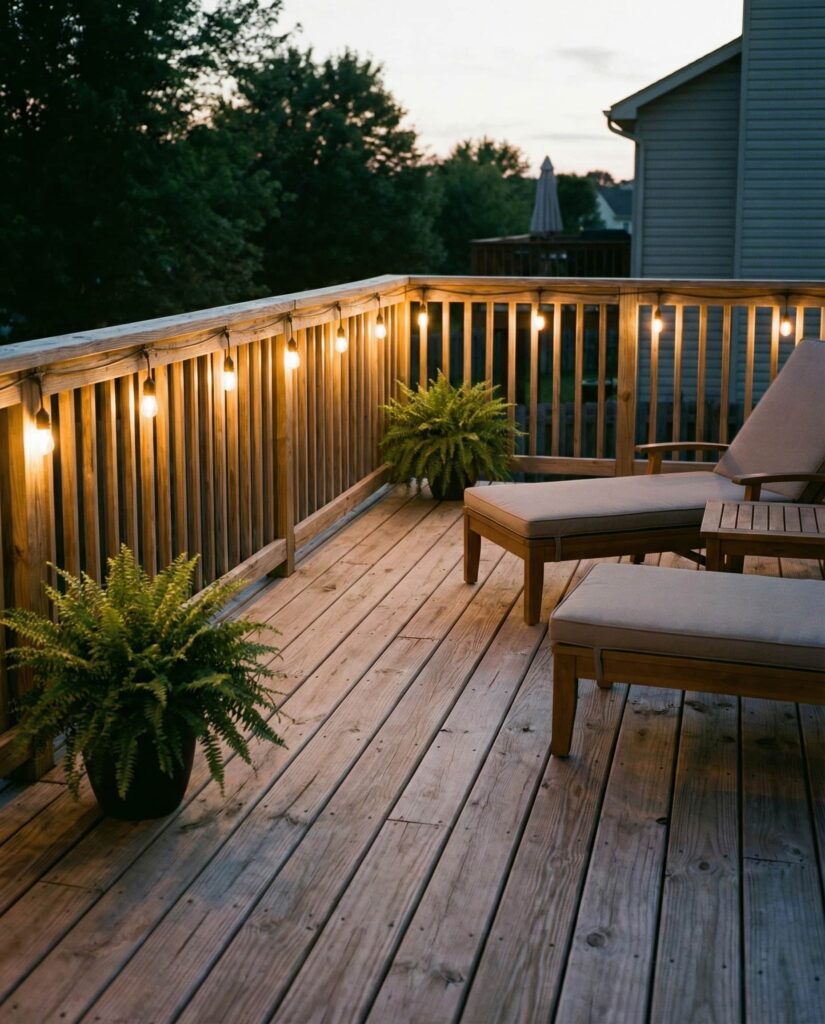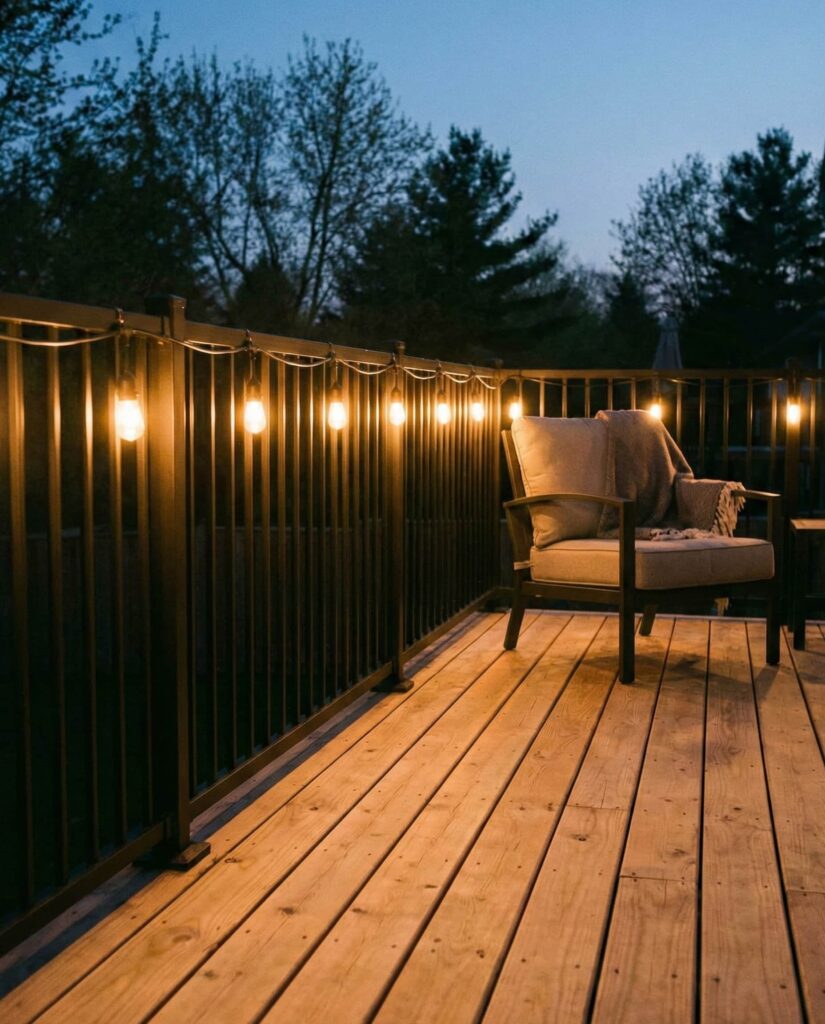 Running string lights along deck railings is one of the most understated deck patio ideas gaining popularity. When to hang lights low and evenly, they provide guidance without glare. I’ve walked on decks lit this way and immediately noticed how calm and safe the space felt. This Old House often recommends low-level lighting for outdoor safety. Beyond practicality, this style keeps sightlines open while adding a continuous glow that enhances nighttime usability.