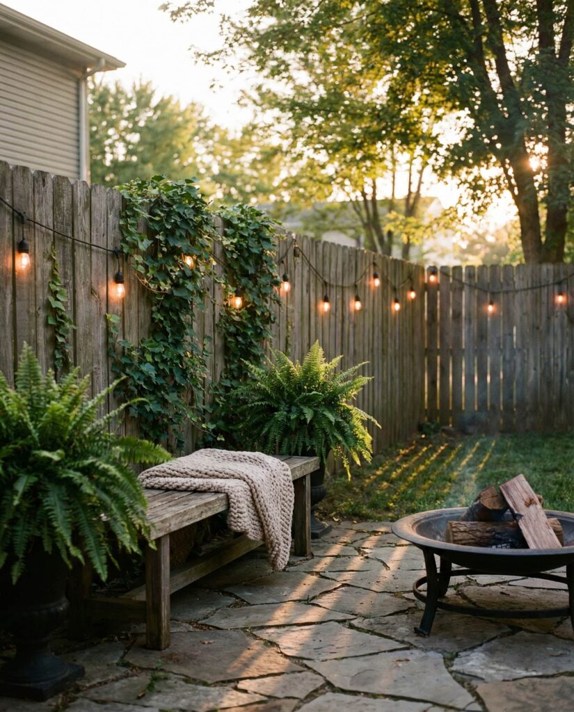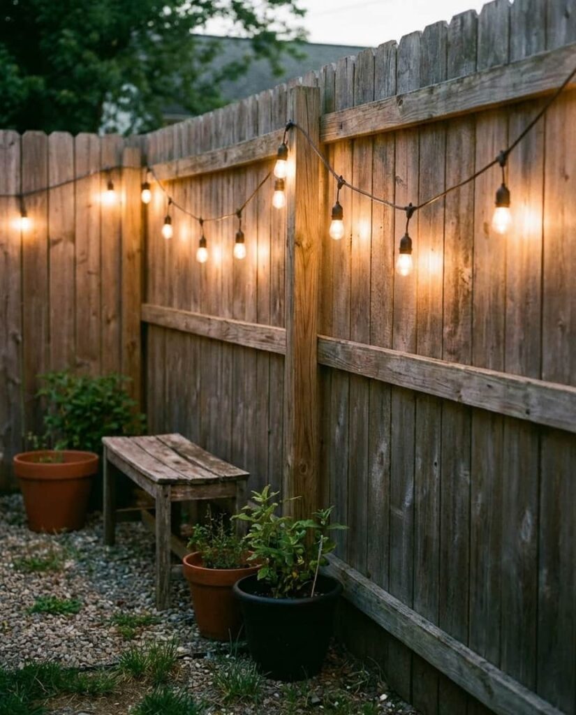 Attaching string lights along a fence is one of the simplest diy upgrades that delivers immediate results. When to hang lights in a straight or gently draped line, the fence becomes a soft boundary rather than a visual block. I’ve used this approach in smaller yards where space is limited, and the effect always makes the area feel wider. Apartment Therapy frequently recommends fence lighting for renters because it’s minimally invasive. This idea works across styles, from modern to farmhouse, and keeps the focus on atmosphere rather than hardware.