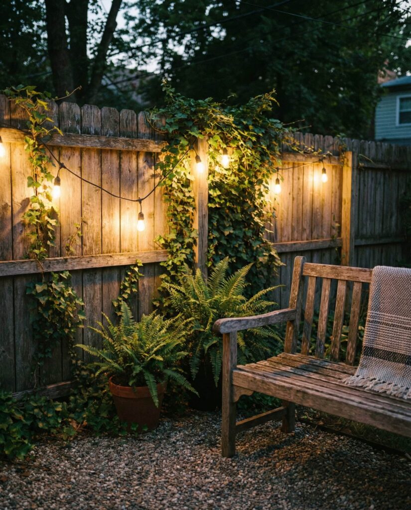 Combining a fence with climbing plants and string lights adds visual depth to flat yard boundaries. When to hang lights slightly offset from greenery, shadows create texture rather than flat illumination. I’ve used this approach in a modest backyard and found it instantly felt more layered. Garden writers at HGTV often emphasize lighting as a way to highlight plants at night. This idea merges landscaping and lighting into one cohesive design move.