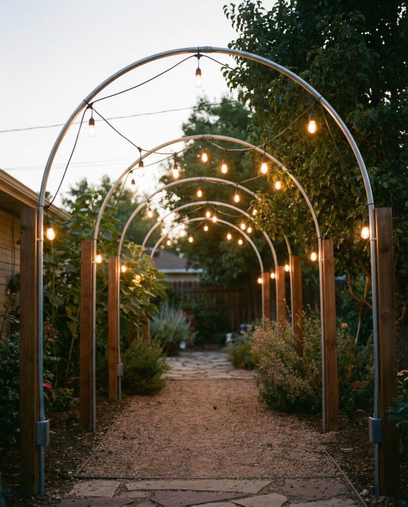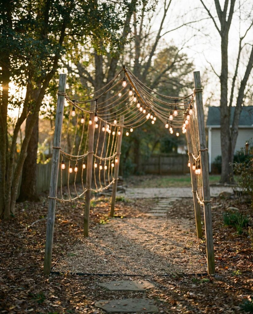 Creating arches with string lights is a bold diy statement that works well for pathways or transitions between yard zones. Using flexible poles or lightweight frames, lights can be to hang in gentle curves that draw the eye forward. I’ve seen this used effectively at casual parties where guests naturally follow the lighted path. Event stylists featured on Martha Stewart Living often use arches to guide movement. It’s an approachable project with dramatic payoff.
