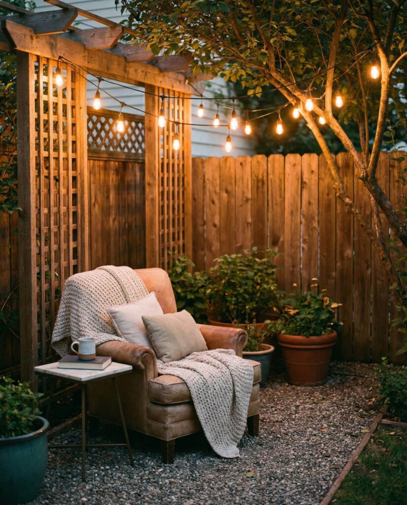 Unused corners are prime candidates for transformation with string lights to hang between walls, posts, or a fence. I’ve personally converted a forgotten corner into my favorite reading spot using nothing more than lights and a chair. Designers at Real Simple often suggest lighting to activate dead zones. This idea fits well with intimate backyard ideas, proving that not every space needs to be large to feel special.