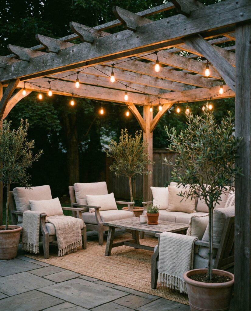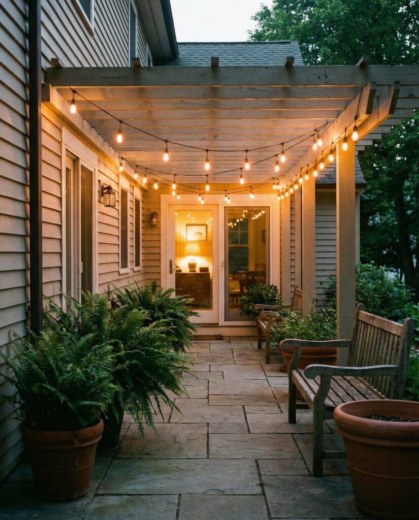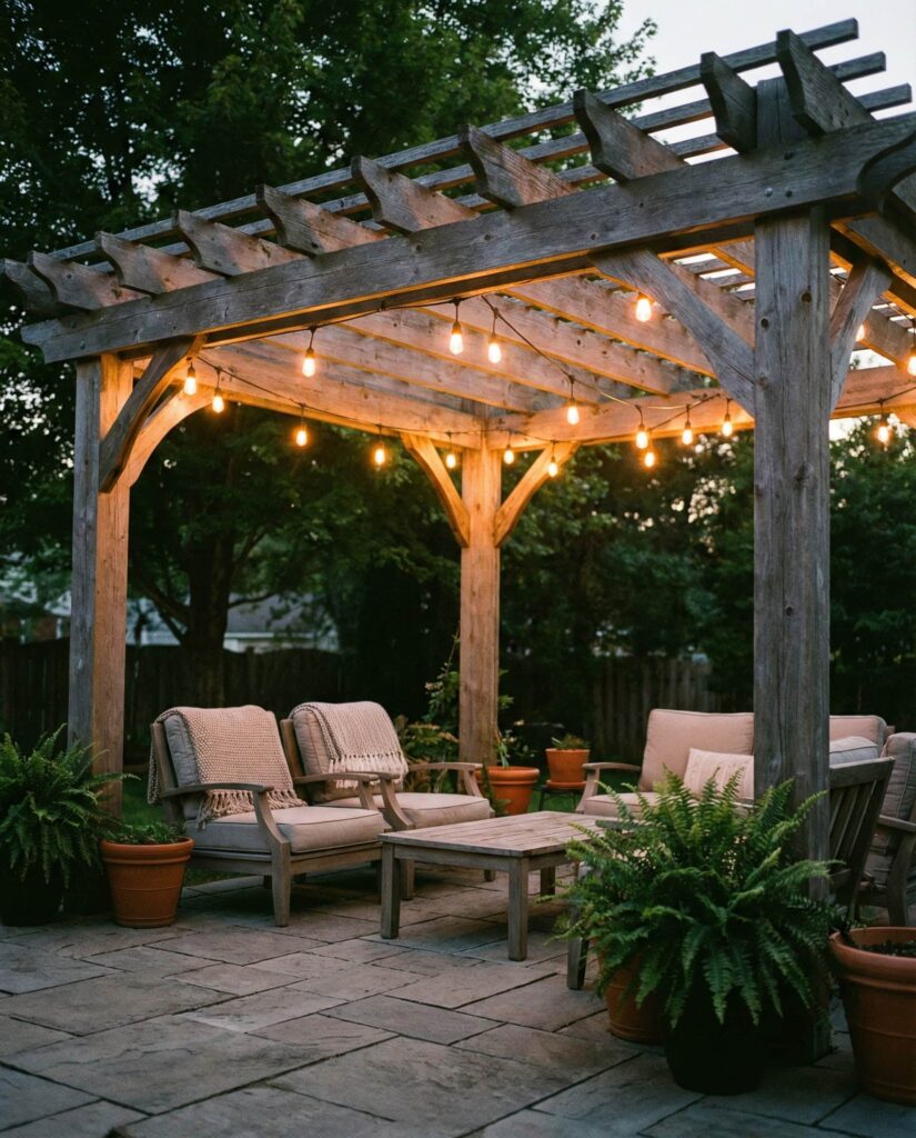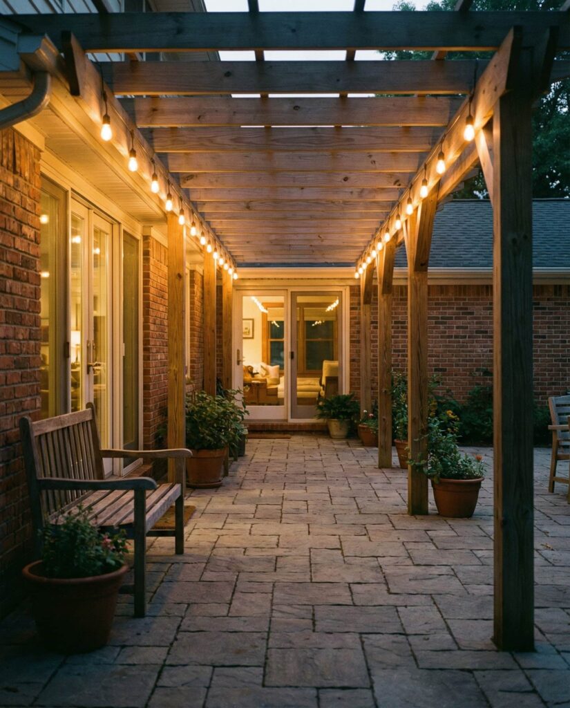 A pergola becomes far more usable when string lights are thoughtfully to hang across its beams, turning it into a true outdoor room. This idea works especially well on a patio or deck, where the structure already provides natural posts for support. I’ve noticed that pergola lighting changes how people move through a space, encouraging them to linger rather than pass through. Writers at Better Homes & Gardens often point out that overhead lighting helps define purpose, whether for dining or relaxing. The soft glow enhances the aesthetic without overpowering conversation, making pergolas feel finished and intentional, even in simple backyard ideas.