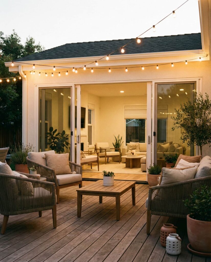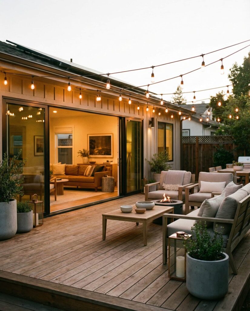Modern deck patio ideas increasingly rely on string lights to blur the line between indoor and outdoor living. When to hang lights along railings or overhead lines, a deck instantly feels like an extension of the home rather than an afterthought. I’ve seen neighbors transform ordinary decks into evening retreats simply by adding warm bulbs that mirror indoor lighting tones. According to Better Homes & Gardens, consistency in light temperature is key to cohesion. Whether paired with a covered patio or open sky, string lights make decks usable long after sunset, reinforcing comfort while supporting everyday family routines.