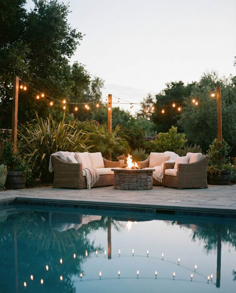 Instead of lighting directly over pool, many homeowners now use string lights to define nearby seating zones around a Pool. Supported by posts or poles, this approach keeps water reflections calm while still providing ambiance. I’ve found conversations flow better when seating is softly lit away from the water’s edge. Pool designers at Pool & Spa News often recommend separating activity and relaxation areas. This lighting strategy achieves that balance with elegance.