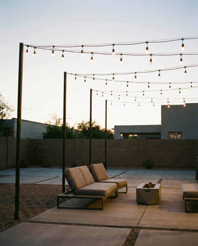 Minimalist design has found its place in outdoor lighting, with string lights to hang in straight, intentional lines supported by slim poles or subtle posts. This style works best in modern backyard layouts where simplicity is the focus. I’ve seen homeowners remove excess decor and let lighting do the visual work, which often makes spaces feel larger and calmer. Design editors at Dezeen frequently highlight restraint as a form of sophistication. By limiting curves and excess elements, this approach delivers clarity, balance, and a quietly confident mood that suits contemporary outdoor living.