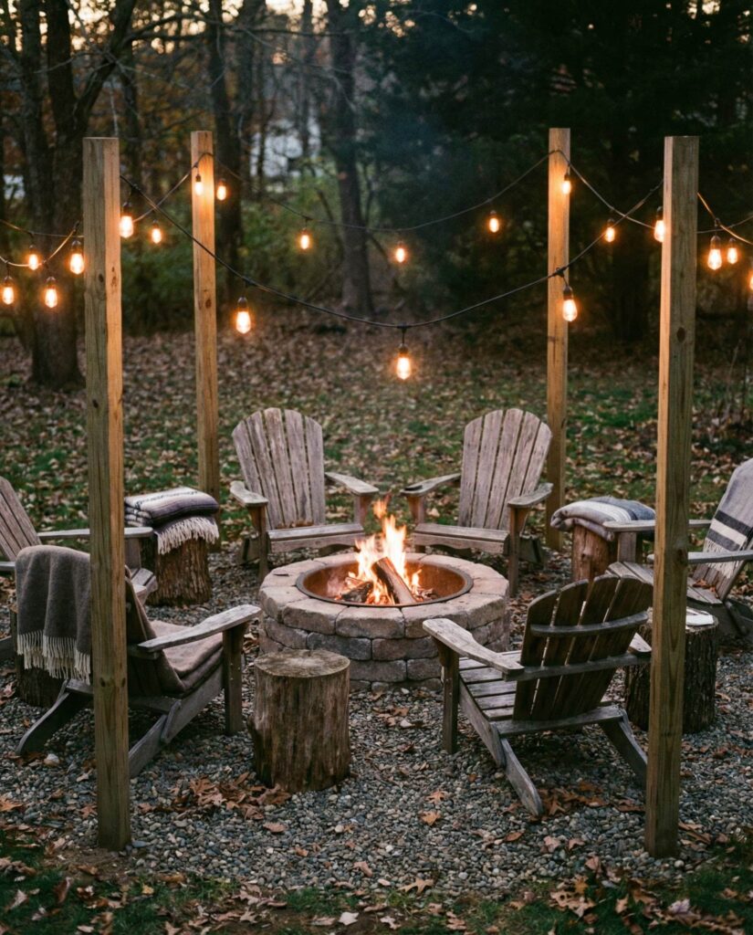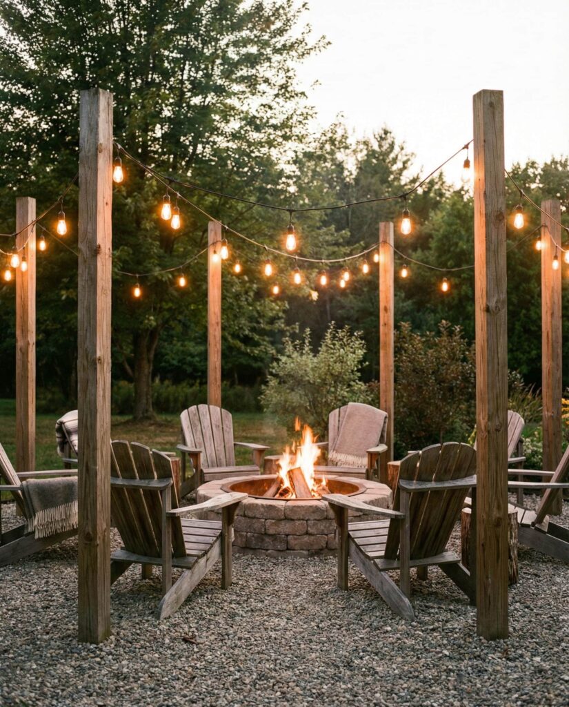 There’s something grounding about pairing wooden poles with string lights around ideas fire pit layouts. This style leans rustic but feels intentional rather than rough. By to hang lights slightly lower around seating, the fire pit becomes the visual anchor while the lights provide balance. I’ve noticed this setup works especially well in rural or suburban backyard spaces where natural materials dominate. Designers featured on Country Living often stress the importance of texture, and wood delivers that warmth effortlessly. The combination encourages longer conversations and slower evenings, exactly what outdoor spaces are meant for.