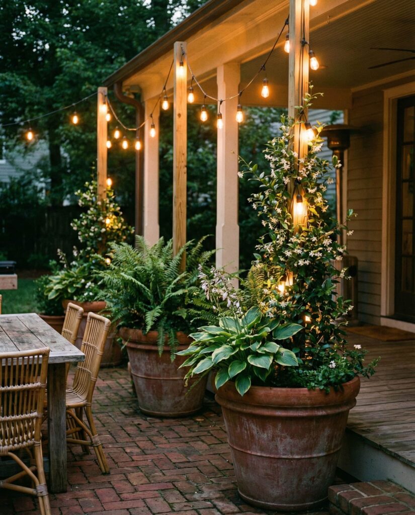 Using Planters with integrated Poles planter systems allows string lights to double as vertical design elements. This method is ideal when you can’t drill into surfaces or want mobility. I’ve seen this used effectively on a porch, where greenery softens the structure while lights add height. Garden designers on Gardenista often praise this approach for blending lighting and landscaping. It’s practical, stylish, and especially appealing for people who like to refresh layouts seasonally.