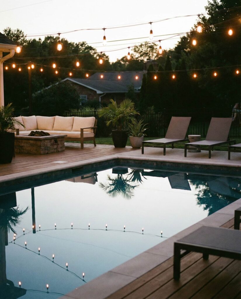 String lights over pool areas bring resort-style comfort to residential spaces. Hung from posts or nearby structures, they provide safety lighting while elevating mood around a Pool. I’ve noticed this setup encourages evening swims and casual gatherings long after sunset. According to Swim University, warm lighting reduces glare compared to harsh fixtures. The effect feels intentional and luxurious without being flashy, making the pool area a true extension of the backyard living zone.
