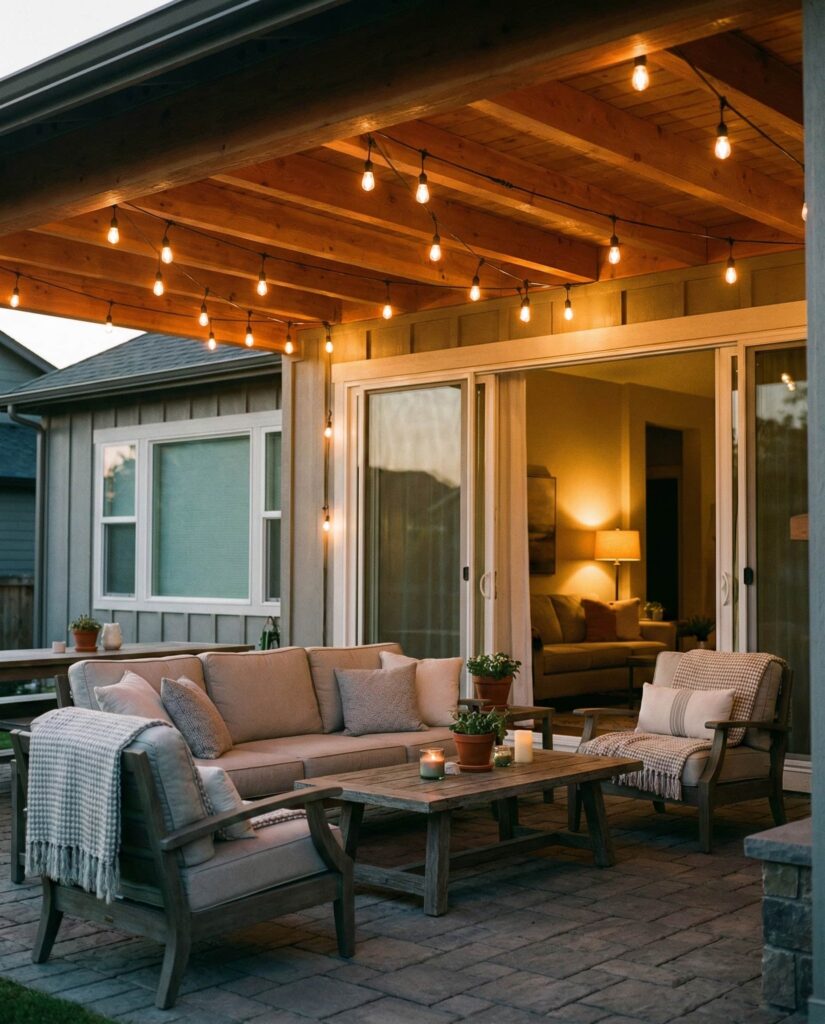 A covered patio benefits enormously when string lights help bridge the gap between inside and outdoors. By to hang lights along beams or ceiling lines, the space feels intentional rather than leftover. I’ve experienced this in homes where dinners naturally drift outside because the lighting feels just as comfortable as indoors. Designers at Houzz often emphasize layered lighting, and string lights serve as the ambient layer that ties everything together, making transitional spaces more livable year-round.