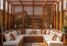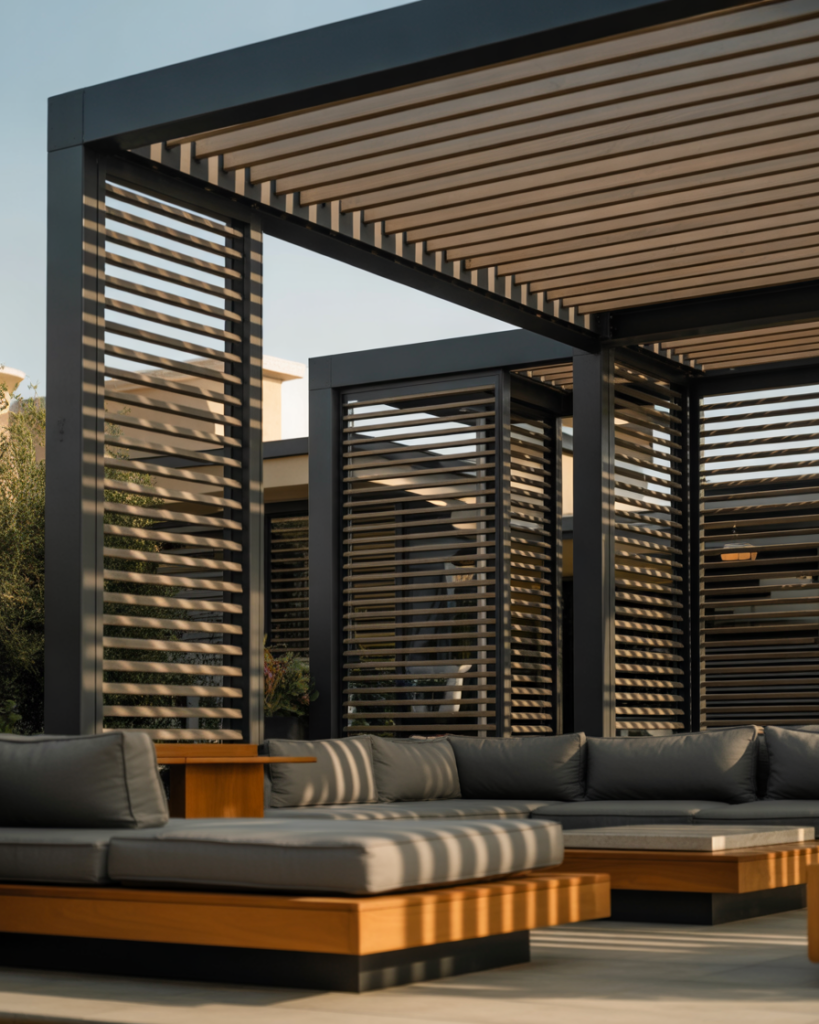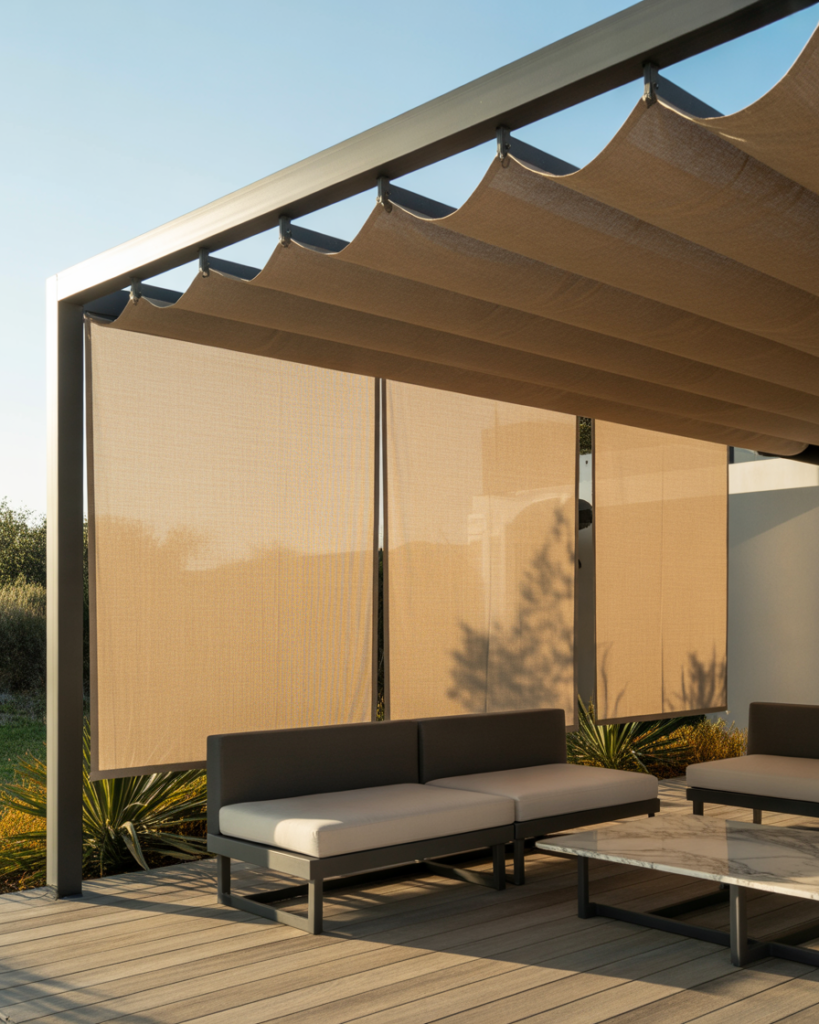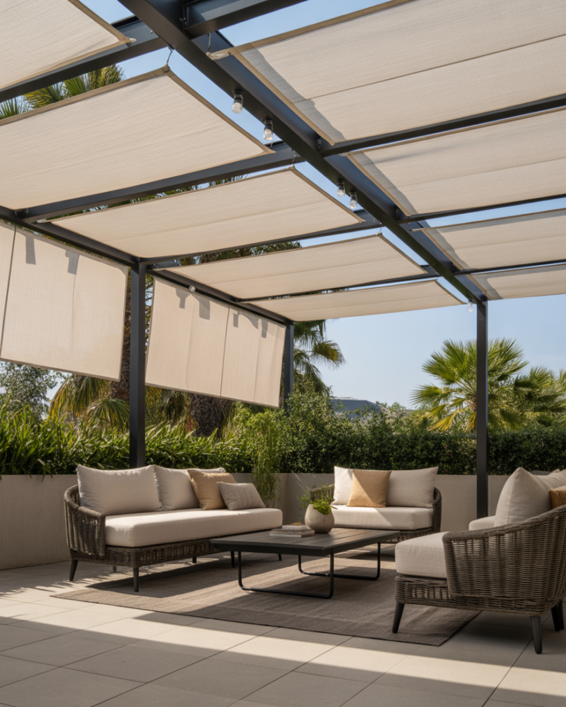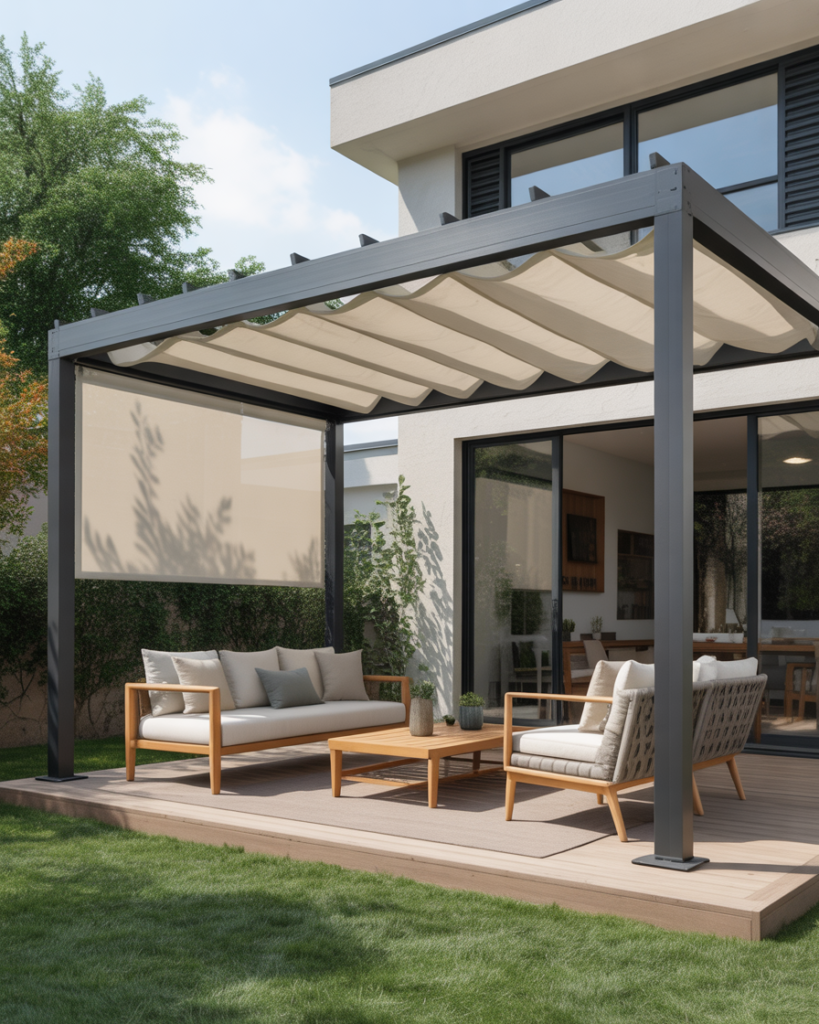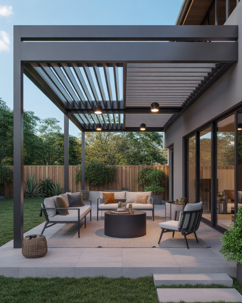 Adjustable slatted roofs offer modern control over light and airflow while remaining surprisingly budget-friendly. Their rotating panels work well for outdoor dining zones, backyard decks, and corner patios where sun levels shift throughout the day. I once saw these installed in a rental duplex where the tenants loved how the shade adapted without requiring major construction—perfect when trying to stay on a budget but still upgrade style.