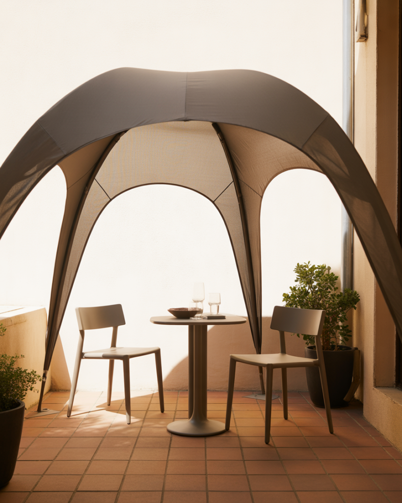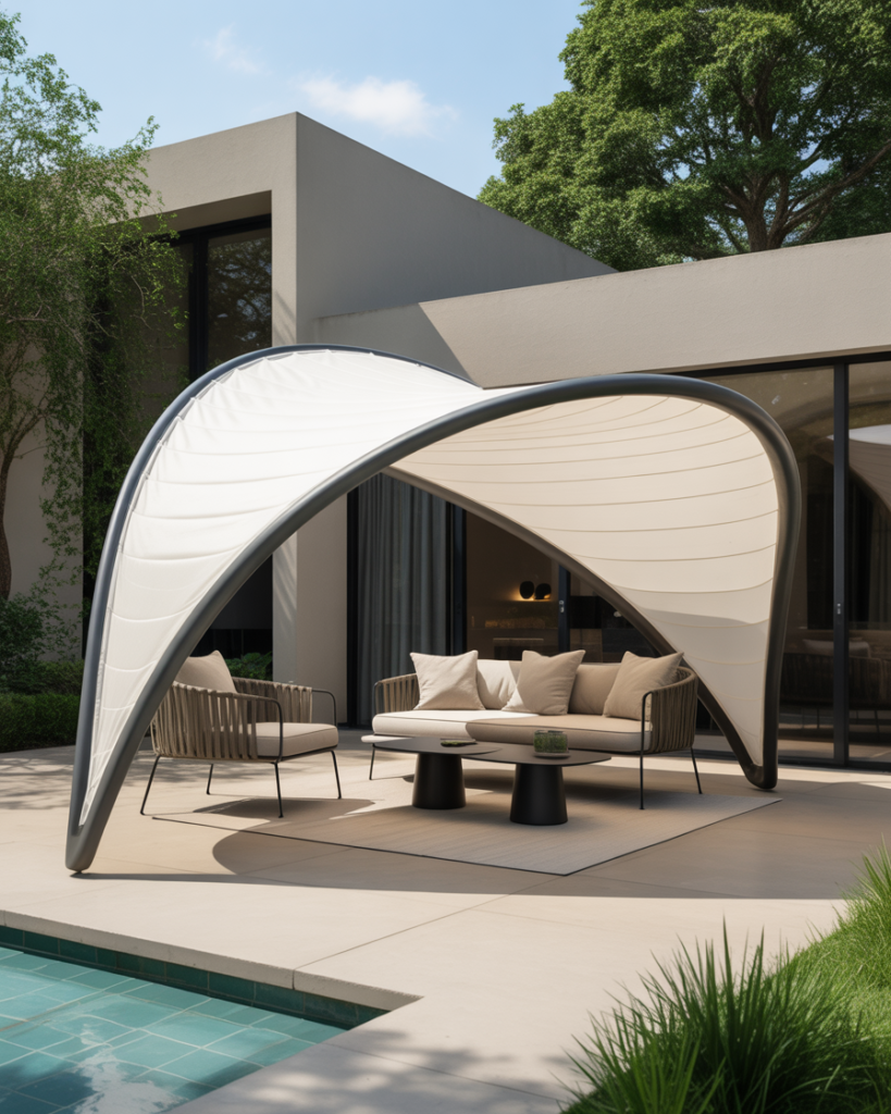 A round canopy brings softer lines than standard rectangular options and suits front patios, apartment balconies, and compact outdoor dining areas. Because they’re portable and budget-friendly, they work perfectly for renters who need shade without permanence. Their curved silhouette adds a sculptural feel that elevates even small patios effortlessly.