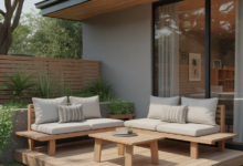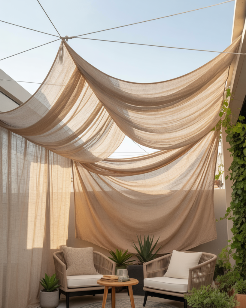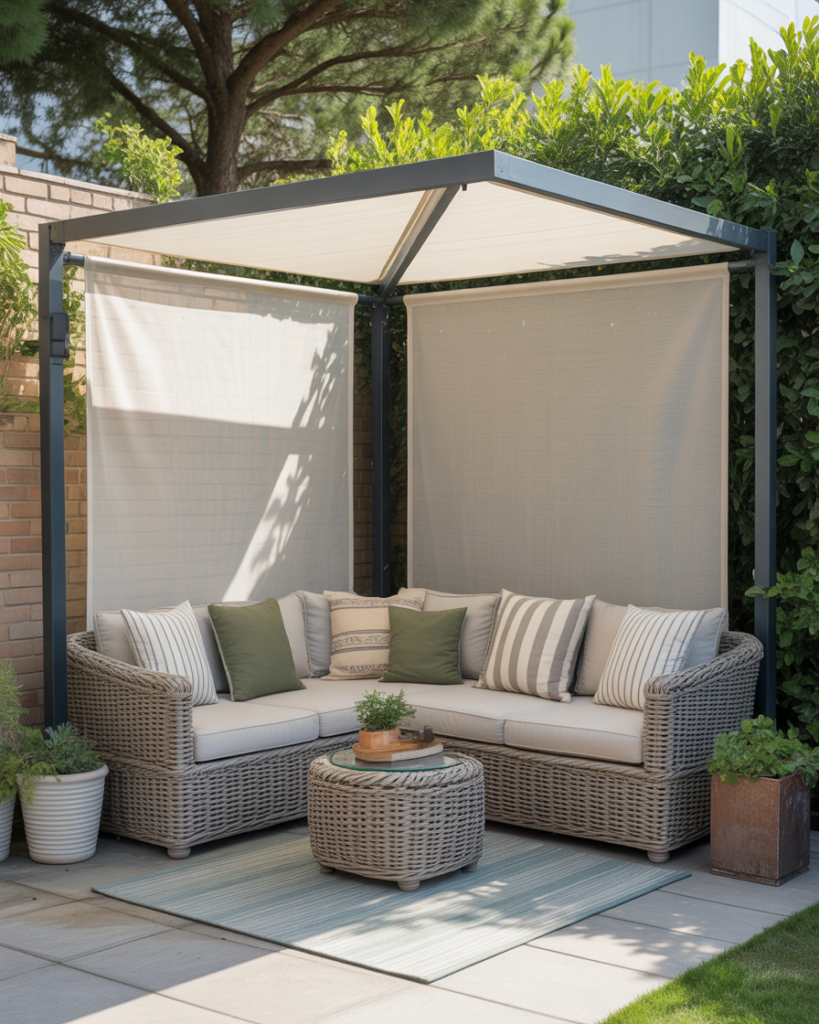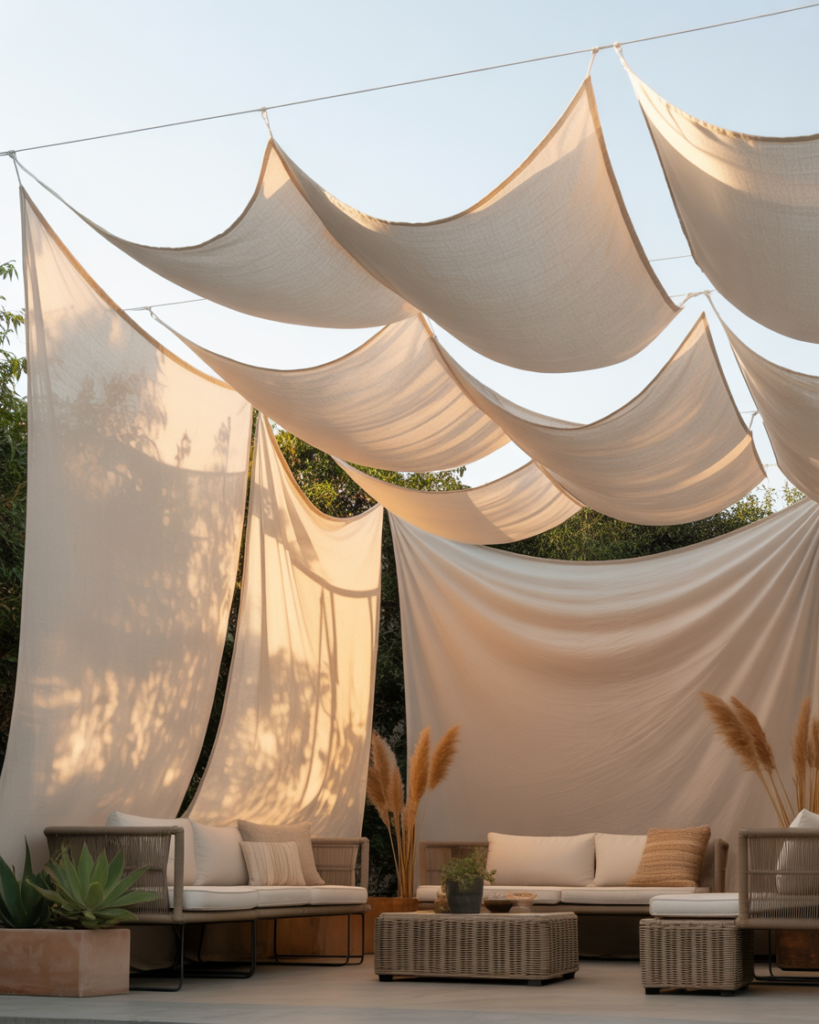 Living shade made with plants—such as trellises, vines, or container trees—works beautifully for a rental, apartment, or side patio. In my old place, tall planter boxes cooled the entire sitting area without requiring structural changes. It’s an easy and charming method to soften sunlight while keeping nature close and keeping everything suitable for renters.